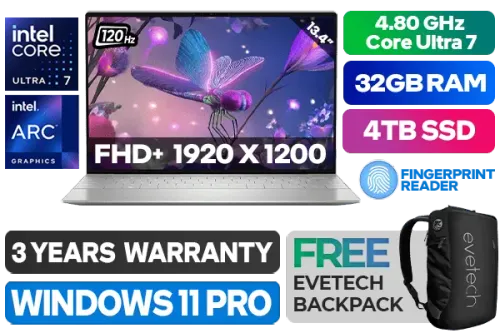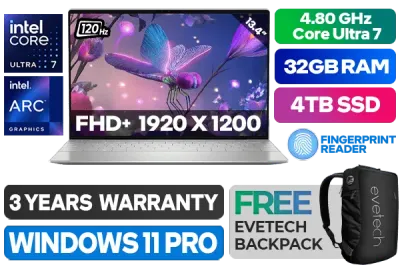 Dell XPS 13 9350-5893 Intel Core Ultra 7-258V up to 4.80GHz Processor, 12MB Cache, 8x Cores, 8x Threads / 32GB LPDDR5 RAM / 4TB Ultra-Fast NVMe SSD / 13.4" FHD+ (1920 x 1200) 120Hz IPS Level Display / Intel Arc Graphics, Supports DirectX 12 / <span style="font-size: 20px; color: #00BFFF; font-weight: bold;">Windows 11 Professional (64bit)</span> / FHD Web Camera with Dual Array Microphone / Intel Wi-Fi 7 BE201 Wireless LAN / Bluetooth 5.4 / Fingerprint Reader / 2 x USB Type-C Thunderbolt 4 (Power Delivery/DisplayPort) / 2W x 4 Dual Realtek speakers / Dell XPS 13 9350 Intel Core Ultra 7 Ultrabook DealDell XPS 13 9350-5893 Intel Core Ultra 7-258V up to 4.80GHz Processor, 12MB Cache, 8x Cores, 8x Threads / 32GB LPDDR5 RAM / 4TB Ultra-Fast NVMe SSD / 13.4" FHD+ (1920 x 1200) 120Hz IPS Level Display / Intel Arc Graphics, Supports DirectX 12 / Windows 11 Professional (64bit) / FHD Web Camera with Dual Array Microphone / Intel Wi-Fi 7 BE201 Wireless LAN / Bluetooth 5.4 / Fingerprint Reader / 2 x USB Type-C Thunderbolt 4 (Power Delivery/DisplayPort) / 2W x 4 Dual Realtek speakers / Dell XPS 13 9350 Intel Core Ultra 7 Ultrabook Deal [NBDEX9350FU7321W1PE/4TB] / [+] GET FREE EVETECH NEO Premium Gaming Backpack / 3 YEARS WARRANTY + FREE DELIVERY !