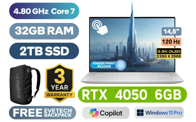 [TOUCHSCREEN] Dell XPS 14 9440 Intel Core 7-155H up to 4.80GHz Processor, 24MB Cache, 16x Cores, 22x Threads / 32GB LPDDR5X RAM / 2TB Ultra-Fast NVMe SSD / 14.5" 3.2K (3200 x 2000) 120Hz OLED Touchscreen Display / NVIDIA GeForce RTX 4050 6GB GDDR6 Dedicated Graphics / <span style="font-size: 20px; color: #00BFFF; font-weight: bold;">Windows 11 Professional (64bit)</span> / 1080p FHD Web Camera with Dual Array Microphone / Platinum Backlit Keyboard / Intel Wi-Fi 6E AX211 Wireless LAN / Bluetooth 5.3 / Fingerprint Reader / 3 x USB Type-C Thunderbolt 4 (Power Delivery/DisplayPort) / 1x Headphone and Microphone Audio Combo Jack / 1 x MicroSD Card Reader / 2 x 2W Dual Stereo speakers / FREE Type-C to HDMI and USB Type-A Adapter / Dell XPS 14 9440 Intel Core Ultra 7 RTX 4050 Laptop Deal[TOUCHSCREEN] Dell XPS 14 9440 Intel Core 7-155H up to 4.80GHz Processor, 24MB Cache, 16x Cores, 22x Threads / 32GB LPDDR5X RAM / 2TB Ultra-Fast NVMe SSD / 14.5" 3.2K (3200 x 2000) 120Hz OLED Touchscreen Display / NVIDIA GeForce RTX 4050 6GB GDDR6 Dedicated Graphics / Windows 11 Professional (64bit) / 1080p FHD Web Camera with Dual Array Microphone / Platinum Backlit Keyboard / Intel Wi-Fi 6E AX211 Wireless LAN / Bluetooth 5.3 / Fingerprint Reader / 3 x USB Type-C Thunderbolt 4 (Power Delivery/DisplayPort) / 1x Headphone and Microphone Audio Combo Jack / 1 x MicroSD Card Reader / 2 x 2W Dual Stereo speakers / FREE Type-C to HDMI and USB Type-A Adapter / Dell XPS 14 9440 Intel Core Ultra 7 RTX 4050 Laptop Deal [NBDEX9440U7321R11PE/2TB] / 3 YEARS WARRANTY / [+] GET FREE EVETECH NEO Premium Gaming Backpack+ FREE DELIVERY !
