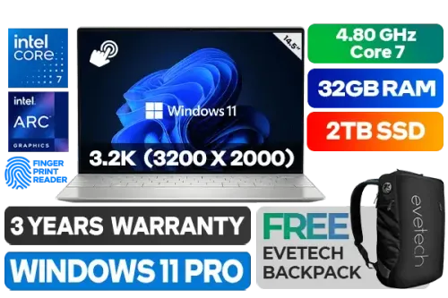 [TOUCHSCREEN] Dell XPS 14 9440-9478 Intel Core 7-155H up to 4.80GHz Processor, 24MB Cache, 16x Cores, 22x Threads / 32GB LPDDR5 RAM / 2TB Ultra-Fast NVMe SSD / 14.5" 3.2K (3200 x 2000) InfinityEdge Touchscreen Display / Intel Arc Graphics, Supports DirectX 12 / <span style="font-size: 20px; color: #00BFFF; font-weight: bold;">Windows 11 Professional (64bit)</span> / FHD Web Camera with Dual Array Microphone / Intel Wi-Fi 6E AX211 Wireless LAN / Bluetooth 5.2 / Fingerprint Reader / 3 x USB Type-C Thunderbolt 4 (Power Delivery/DisplayPort) / 1 x MicroSD Card Reader / 2 x 2W Dual Stereo speakers / FREE Adapter Type-C to USB & HDMI / Dell XPS 14 9440 Intel Core Ultra 7 Touchscreen Ultrabook Deal[TOUCHSCREEN] Dell XPS 14 9440-9478 Intel Core 7-155H up to 4.80GHz Processor, 24MB Cache, 16x Cores, 22x Threads / 32GB LPDDR5 RAM / 2TB Ultra-Fast NVMe SSD / 14.5" 3.2K (3200 x 2000) InfinityEdge Touchscreen Display / Intel Arc Graphics, Supports DirectX 12 / Windows 11 Professional (64bit) / FHD Web Camera with Dual Array Microphone / Intel Wi-Fi 6E AX211 Wireless LAN / Bluetooth 5.2 / Fingerprint Reader / 3 x USB Type-C Thunderbolt 4 (Power Delivery/DisplayPort) / 1 x MicroSD Card Reader / 2 x 2W Dual Stereo speakers / FREE Adapter Type-C to USB & HDMI / Dell XPS 14 9440 Intel Core Ultra 7 Touchscreen Ultrabook Deal [NBDEX9440U7321W11PE/2TB] / 3 YEARS WARRANTY / [+] GET FREE EVETECH NEO Premium Gaming Backpack+ FREE DELIVERY !