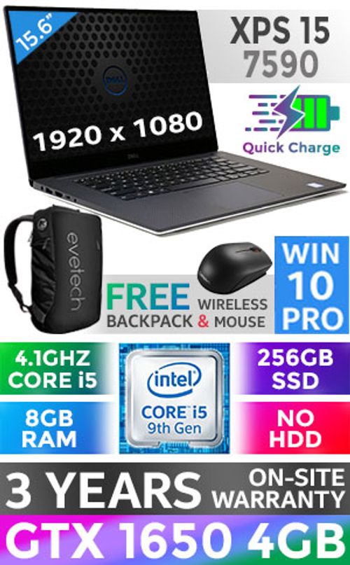 Dell XPS 15 7590 9th Gen Intel Core i5-9300H up to 4.10GHz 8MB Cache Processor, 4x Cores, 8x Threads / 8GB DDR4 RAM / 256GB Ultra-Fast NVMe SSD / 15.6" Full HD 1920 x 1080 Anti-glare InfinityEdge Display / NVIDIA GeForce GTX 1650 4GB GDDR5 DirectX 12 Dedicated Graphics Card / <span style="color:red; font-size:18px;">Windows 10 Professional (64bit)</span> / Single White Color Backlit Keyboard / HD Web Camera with Dual Array Digital Microphone / Fingerprint Reader / Killer AX1650 2x2 Wireless LAN / Bluetooth 5.0 / 2 x USB 3.1 Type-A / 1 x USB 3.1 Type-C (Thunderbolt™ 3) / 1 x HDMI 2.0 / 1x SD Card Reader / Ultralight 2kg / 2 x 2W Waves MaxxAudio® Pro Stereo speakers / <span style="font-size:18px; color:blue;">DELL 3 YEAR NEXT DAY ON-SITE WARRANTY</span> / Dell XPS 15 GTX 1650 Core i5 UltrabookDell XPS 15 7590 9th Gen Intel Core i5-9300H up to 4.10GHz 8MB Cache Processor, 4x Cores, 8x Threads / 8GB DDR4 RAM / 256GB Ultra-Fast NVMe SSD / 15.6" Full HD 1920 x 1080 Anti-glare InfinityEdge Display / NVIDIA GeForce GTX 1650 4GB GDDR5 DirectX 12 Dedicated Graphics Card / Windows 10 Professional (64bit) / Single White Color Backlit Keyboard / HD Web Camera with Dual Array Digital Microphone / Fingerprint Reader / Killer AX1650 2x2 Wireless LAN / Bluetooth 5.0 / 2 x USB 3.1 Type-A / 1 x USB 3.1 Type-C (Thunderbolt™ 3) / 1 x HDMI 2.0 / 1x SD Card Reader / Ultralight 2kg / 2 x 2W Waves MaxxAudio® Pro Stereo speakers / DELL 3 YEAR NEXT DAY ON-SITE WARRANTY / Dell XPS 15 GTX 1650 Core i5 Ultrabook [XPS15-I59300-8256P-EVE] / [+] GET FREE EVETECH NEO Premium Gaming Backpack+ FREE DELIVERY !