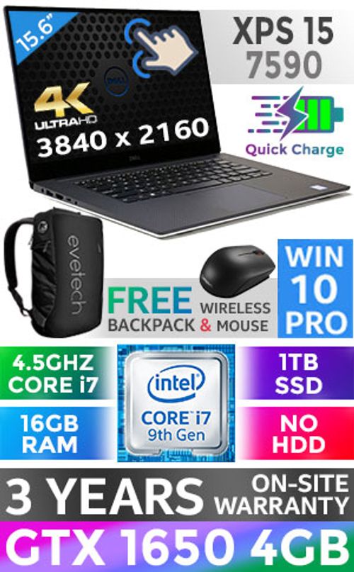 [<span style="font-size: 20px; color:red;">4K TOUCHSCREEN</span>] Dell XPS 15 7590 9th Gen Intel Core i7-9750H up to 4.5GHz Processor, 12MB Cache, 6x Cores, 12x Threads / 16GB DDR4 RAM / 1TB Ultra-Fast NVMe SSD / 15.6" Ultra HD 3840 x 2160 InfinityEdge Display With Touchscreen / NVIDIA GeForce GTX 1650 4GB GDDR5 DirectX 12 Dedicated Graphics Card / <span style="color:red; font-size:18px;">Windows 10 Professional (64bit)</span> / Single White Color Backlit Keyboard / HD Web Camera with Dual Array Digital Microphone / Fingerprint Reader / Killer AX1650 2x2 Wireless LAN / Bluetooth 5.0 / 2 x USB 3.1 Type-A / 1 x USB 3.1 Type-C (Thunderbolt™ 3) / 1 x HDMI 2.0 / 1x SD Card Reader / Up to 20 Hours Battery Life / Ultralight 2kg / 2 x 2W Waves MaxxAudio® Pro Stereo speakers / <span style="font-size:18px; color:blue;">DELL 3 YEAR NEXT DAY ON-SITE WARRANTY</span> / Dell XPS 15 Core i7 Touchscreen Ultrabook[4K TOUCHSCREEN] Dell XPS 15 7590 9th Gen Intel Core i7-9750H up to 4.5GHz Processor, 12MB Cache, 6x Cores, 12x Threads / 16GB DDR4 RAM / 1TB Ultra-Fast NVMe SSD / 15.6" Ultra HD 3840 x 2160 InfinityEdge Display With Touchscreen / NVIDIA GeForce GTX 1650 4GB GDDR5 DirectX 12 Dedicated Graphics Card / Windows 10 Professional (64bit) / Single White Color Backlit Keyboard / HD Web Camera with Dual Array Digital Microphone / Fingerprint Reader / Killer AX1650 2x2 Wireless LAN / Bluetooth 5.0 / 2 x USB 3.1 Type-A / 1 x USB 3.1 Type-C (Thunderbolt™ 3) / 1 x HDMI 2.0 / 1x SD Card Reader / Up to 20 Hours Battery Life / Ultralight 2kg / 2 x 2W Waves MaxxAudio® Pro Stereo speakers / DELL 3 YEAR NEXT DAY ON-SITE WARRANTY / Dell XPS 15 Core i7 Touchscreen Ultrabook [XPS15-I79750H-161TB-EVE] / [+] GET FREE EVETECH NEO Premium Gaming Backpack+ FREE DELIVERY !
