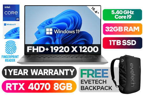 Dell XPS 15 9530-9157 13th Gen Intel Core i9-13900H up to 5.40GHz Processor, 24MB Cache, 14x Cores, 20x Threads / 32GB DDR5 RAM / 1TB Ultra-Fast NVME SSD / 15.6" Full HD+ 1920 x 1200 Anti-glare IPS-Level InfinityEdge Display / NVIDIA 40 Series GeForce RTX 4070 8GB GDDR6 Dedicated Graphics / Windows 11 Home (64bit) / Single White Color Backlit Keyboard / HD Web Camera with Dual Array Microphone / Fingerprint Reader / Dual Band WiFi 6E Wireless LAN / Bluetooth 5.2 / 1 x USB Type-C With DisplayPort / 2 x USB Type-C (Thunderbolt™ 4) / 1 x Mic-in/Headphone-out Combo Jack / 1x SD Card Reader / 2 x 2.5W Waves Nx® 3D Audio / FREE Type-C to HDMI and USB Adapter / 1 Year Warranty / Dell XPS 15 9530 Core i9 RTX 4070 Ultrabook DealDell XPS 15 9530-9157 13th Gen Intel Core i9-13900H up to 5.40GHz Processor, 24MB Cache, 14x Cores, 20x Threads / 32GB DDR5 RAM / 1TB Ultra-Fast NVME SSD / 15.6" Full HD+ 1920 x 1200 Anti-glare IPS-Level InfinityEdge Display / NVIDIA 40 Series GeForce RTX 4070 8GB GDDR6 Dedicated Graphics / Windows 11 Home (64bit) / Single White Color Backlit Keyboard / HD Web Camera with Dual Array Microphone / Fingerprint Reader / Dual Band WiFi 6E Wireless LAN / Bluetooth 5.2 / 1 x USB Type-C With DisplayPort / 2 x USB Type-C (Thunderbolt™ 4) / 1 x Mic-in/Headphone-out Combo Jack / 1x SD Card Reader / 2 x 2.5W Waves Nx® 3D Audio / FREE Type-C to HDMI and USB Adapter / 1 Year Warranty / Dell XPS 15 9530 Core i9 RTX 4070 Ultrabook Deal [FIORANORPL2800HFT] / [+] GET FREE EVETECH NEO Premium Gaming Backpack+ FREE DELIVERY !