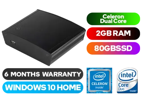 Evetech ENUC Intel Dual Core Mini PC / Intel Celeron Dual Core 2MB Cache CPU / 2GB DDR3 RAM / Intel 530 80GB SSD / WINDOWS 10 Home 64-bit / VESA Mount Included / External 65W PSU Included / Integrated Intel HD Graphics / Anodized aluminium Chassis construction / + FREE TP-LINK 300Mbps Wifi USB Dongle Included / Evetech ENUC