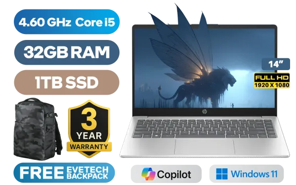 HP Laptop 14-ep0026ni 13th Gen Intel Core i5-1334U up to 4.60GHz Processor, 12MB Cache, 10x Cores, 12x Threads / 32GB DDR4 RAM / 1TB Ultra-Fast NVME SSD / 14" FHD (1920 x 1080) Anti-Glare Display / Integrated Intel Iris Xe Graphics / Windows 11 Home(64bit) / Realtek 8852BE-VT WiFi 6 Wireless LAN / Bluetooth 5.4 / 720p HD camera / 2x USB Type-A / 1x USB Type-C (Supports DisplayPort) / 1x HDMI / 1x Headphone And Microphone Combo Jack / Dual Speakers / HP Laptop 14s-ep0026ni Intel Core i5 LaptopHP Laptop 14-ep0026ni 13th Gen Intel Core i5-1334U up to 4.60GHz Processor, 12MB Cache, 10x Cores, 12x Threads / 32GB DDR4 RAM / 1TB Ultra-Fast NVME SSD / 14" FHD (1920 x 1080) Anti-Glare Display / Integrated Intel Iris Xe Graphics / Windows 11 Home(64bit) / Realtek 8852BE-VT WiFi 6 Wireless LAN / Bluetooth 5.4 / 720p HD camera / 2x USB Type-A / 1x USB Type-C (Supports DisplayPort) / 1x HDMI / 1x Headphone And Microphone Combo Jack / Dual Speakers / HP Laptop 14s-ep0026ni Intel Core i5 Laptop [C92D1EA/32GB/1TB] / 3 YEARS WARRANTY / [+] GET FREE EVETECH DASH Premium Gaming Backpack+ FREE DELIVERY !