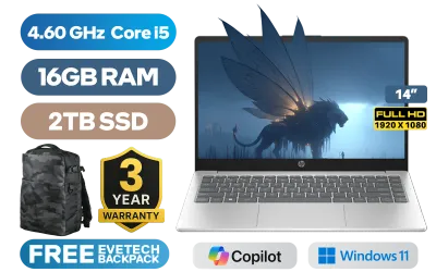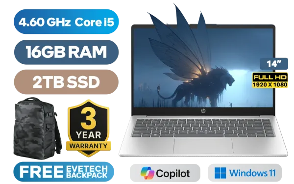 HP Laptop 14-ep0026ni 13th Gen Intel Core i5-1334U up to 4.60GHz Processor, 12MB Cache, 10x Cores, 12x Threads / 16GB DDR4 RAM / 2TB Ultra-Fast NVME SSD / 14" FHD (1920 x 1080) Anti-Glare Display / Integrated Intel Iris Xe Graphics / Windows 11 Home(64bit) / Realtek 8852BE-VT WiFi 6 Wireless LAN / Bluetooth 5.4 / 720p HD camera / 2x USB Type-A / 1x USB Type-C (Supports DisplayPort) / 1x HDMI / 1x Headphone And Microphone Combo Jack / Dual Speakers / HP Laptop 14s-ep0026ni Intel Core i5 LaptopHP Laptop 14-ep0026ni 13th Gen Intel Core i5-1334U up to 4.60GHz Processor, 12MB Cache, 10x Cores, 12x Threads / 16GB DDR4 RAM / 2TB Ultra-Fast NVME SSD / 14" FHD (1920 x 1080) Anti-Glare Display / Integrated Intel Iris Xe Graphics / Windows 11 Home(64bit) / Realtek 8852BE-VT WiFi 6 Wireless LAN / Bluetooth 5.4 / 720p HD camera / 2x USB Type-A / 1x USB Type-C (Supports DisplayPort) / 1x HDMI / 1x Headphone And Microphone Combo Jack / Dual Speakers / HP Laptop 14s-ep0026ni Intel Core i5 Laptop [C92D1EA/2TB] / 3 YEARS WARRANTY / [+] GET FREE EVETECH DASH Premium Gaming Backpack+ FREE DELIVERY !