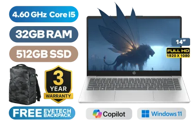 HP Laptop 14-ep0026ni 13th Gen Intel Core i5-1334U up to 4.60GHz Processor, 12MB Cache, 10x Cores, 12x Threads / 32GB DDR4 RAM / 512GB Ultra-Fast NVME SSD / 14" FHD (1920 x 1080) Anti-Glare Display / Integrated Intel Iris Xe Graphics / Windows 11 Home(64bit) / Realtek 8852BE-VT WiFi 6 Wireless LAN / Bluetooth 5.4 / 720p HD camera / 2x USB Type-A / 1x USB Type-C (Supports DisplayPort) / 1x HDMI / 1x Headphone And Microphone Combo Jack / Dual Speakers / HP Laptop 14s-ep0026ni Intel Core i5 LaptopHP Laptop 14-ep0026ni 13th Gen Intel Core i5-1334U up to 4.60GHz Processor, 12MB Cache, 10x Cores, 12x Threads / 32GB DDR4 RAM / 512GB Ultra-Fast NVME SSD / 14" FHD (1920 x 1080) Anti-Glare Display / Integrated Intel Iris Xe Graphics / Windows 11 Home(64bit) / Realtek 8852BE-VT WiFi 6 Wireless LAN / Bluetooth 5.4 / 720p HD camera / 2x USB Type-A / 1x USB Type-C (Supports DisplayPort) / 1x HDMI / 1x Headphone And Microphone Combo Jack / Dual Speakers / HP Laptop 14s-ep0026ni Intel Core i5 Laptop [C92D1EA/32GB] / 3 YEARS WARRANTY / [+] GET FREE EVETECH DASH Premium Gaming Backpack+ FREE DELIVERY !