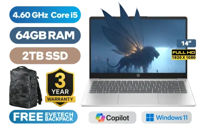 HP Laptop 14-ep0026ni 13th Gen Intel Core i5-1334U up to 4.60GHz Processor, 12MB Cache, 10x Cores, 12x Threads / 64GB DDR4 RAM / 2TB Ultra-Fast NVME SSD / 14" FHD (1920 x 1080) Anti-Glare Display / Integrated Intel Iris Xe Graphics / Windows 11 Home(64bit) / Realtek 8852BE-VT WiFi 6 Wireless LAN / Bluetooth 5.4 / 720p HD camera / 2x USB Type-A / 1x USB Type-C (Supports DisplayPort) / 1x HDMI / 1x Headphone And Microphone Combo Jack / Dual Speakers / HP Laptop 14s-ep0026ni Intel Core i5 LaptopHP Laptop 14-ep0026ni 13th Gen Intel Core i5-1334U up to 4.60GHz Processor, 12MB Cache, 10x Cores, 12x Threads / 64GB DDR4 RAM / 2TB Ultra-Fast NVME SSD / 14" FHD (1920 x 1080) Anti-Glare Display / Integrated Intel Iris Xe Graphics / Windows 11 Home(64bit) / Realtek 8852BE-VT WiFi 6 Wireless LAN / Bluetooth 5.4 / 720p HD camera / 2x USB Type-A / 1x USB Type-C (Supports DisplayPort) / 1x HDMI / 1x Headphone And Microphone Combo Jack / Dual Speakers / HP Laptop 14s-ep0026ni Intel Core i5 Laptop [C92D1EA/64GB/2TB] / 3 YEARS WARRANTY / [+] GET FREE EVETECH DASH Premium Gaming Backpack+ FREE DELIVERY !