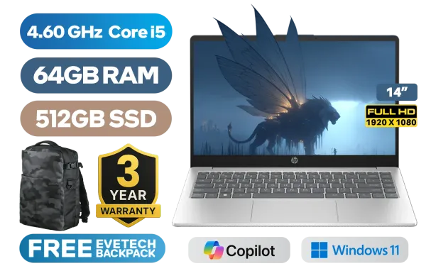 HP Laptop 14-ep0026ni 13th Gen Intel Core i5-1334U up to 4.60GHz Processor, 12MB Cache, 10x Cores, 12x Threads / 64GB DDR4 RAM / 512GB Ultra-Fast NVME SSD / 14" FHD (1920 x 1080) Anti-Glare Display / Integrated Intel Iris Xe Graphics / Windows 11 Home(64bit) / Realtek 8852BE-VT WiFi 6 Wireless LAN / Bluetooth 5.4 / 720p HD camera / 2x USB Type-A / 1x USB Type-C (Supports DisplayPort) / 1x HDMI / 1x Headphone And Microphone Combo Jack / Dual Speakers / HP Laptop 14s-ep0026ni Intel Core i5 LaptopHP Laptop 14-ep0026ni 13th Gen Intel Core i5-1334U up to 4.60GHz Processor, 12MB Cache, 10x Cores, 12x Threads / 64GB DDR4 RAM / 512GB Ultra-Fast NVME SSD / 14" FHD (1920 x 1080) Anti-Glare Display / Integrated Intel Iris Xe Graphics / Windows 11 Home(64bit) / Realtek 8852BE-VT WiFi 6 Wireless LAN / Bluetooth 5.4 / 720p HD camera / 2x USB Type-A / 1x USB Type-C (Supports DisplayPort) / 1x HDMI / 1x Headphone And Microphone Combo Jack / Dual Speakers / HP Laptop 14s-ep0026ni Intel Core i5 Laptop [C92D1EA/64GB] / 3 YEARS WARRANTY / [+] GET FREE EVETECH DASH Premium Gaming Backpack+ FREE DELIVERY !