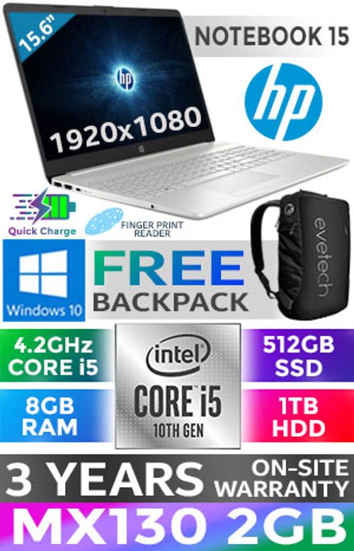 HP Notebook 15-dw1002ni 10th Gen Intel Comet Lake Core i5-10210U up to 4.2GHz Processor, 6MB Cache, 4x Cores, 8x Threads / 8GB DDR4 RAM / 512GB Ultra-Fast SSD + 1TB Hard Drive / 15.6" FHD 1920x1080 Anti-glare IPS Display / NVIDIA Geforce MX130 2GB GDDR5 DirectX 12 Dedicated Graphics Card / 802.11 AC Wireless LAN / Bluetooth 5 / HP TrueVision HD Camera with Integrated Digital Microphone / Windows 10 Home 64bit / 2x USB 3.1 Type-A / 1x USB 3.1 Type-C / 1x HDMI / 1x Headphone and Microphone Combo Jack / Integrated GbE LAN / <span style="font-size:19px; color:#da2c83;">FINGERPRINT READER</span> / No DVD Drive Included / Full-Size Island Style Natural Silver Keyboard / Touchpad with multi-touch gesture support / Dual front-facing speakers / Ultra-light Weight 2.5kg / <span style="font-size:18px; color:red;">3 YEAR ON-SITE WARRANTY</span> / Supports battery fast charge: approximately 50% in 45 minutes / HP 15 10th GenCore i5 Laptop DealHP Notebook 15-dw1002ni 10th Gen Intel Comet Lake Core i5-10210U up to 4.2GHz Processor, 6MB Cache, 4x Cores, 8x Threads / 8GB DDR4 RAM / 512GB Ultra-Fast SSD + 1TB Hard Drive / 15.6" FHD 1920x1080 Anti-glare IPS Display / NVIDIA Geforce MX130 2GB GDDR5 DirectX 12 Dedicated Graphics Card / 802.11 AC Wireless LAN / Bluetooth 5 / HP TrueVision HD Camera with Integrated Digital Microphone / Windows 10 Home 64bit / 2x USB 3.1 Type-A / 1x USB 3.1 Type-C / 1x HDMI / 1x Headphone and Microphone Combo Jack / Integrated GbE LAN / FINGERPRINT READER / No DVD Drive Included / Full-Size Island Style Natural Silver Keyboard / Touchpad with multi-touch gesture support / Dual front-facing speakers / Ultra-light Weight 2.5kg / 3 YEAR ON-SITE WARRANTY / Supports battery fast charge: approximately 50% in 45 minutes / HP 15 10th GenCore i5 Laptop Deal [9CL17EA/8GB/512GB] / [+] GET FREE EVETECH NEO Premium Gaming Backpack+ FREE DELIVERY !