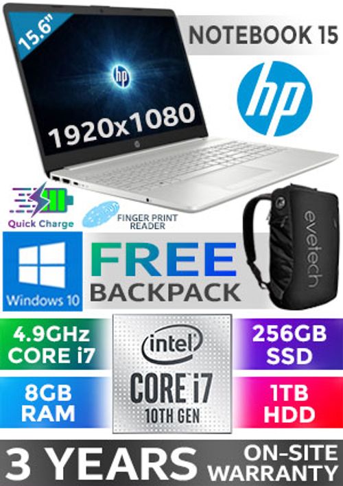 HP Notebook 15-dw1001ni 10th Gen Intel Comet Lake Core i7-10510U up to 4.9GHz Processor, 8MB Cache, 4x Cores, 8x Threads / 8GB DDR4 RAM / 256GB Ultra-Fast SSD + 1TB Hard Drive / 15.6" FHD 1920x1080 Anti-glare WLED-backlit Display / Integrated Intel UHD Graphics 620, DirectX 12 Support / 802.11 AC Wireless LAN / Bluetooth 5 / HP TrueVision HD Camera with Integrated Digital Microphone / Windows 10 Home 64bit / 2x USB 3.1 Type-A / 1x USB 3.1 Type-C / 1x HDMI / 1x Headphone and Microphone Combo Jack / Integrated GbE LAN / 1x Multi-format SD Card Reader / <span style="font-size:19px; color:#da2c83;">FINGERPRINT READER</span> / No DVD Drive Included / Full-Size Island Style Natural Silver Keyboard / Touchpad with multi-touch gesture support / Dual front-facing speakers / Ultra-light Weight 2.5kg / <span style="font-size:18px; color:red;">3 YEAR ON-SITE WARRANTY</span>/ Supports battery fast charge: approximately 50% in 45 minutes / HP 15 Core i7 Laptop DealHP Notebook 15-dw1001ni 10th Gen Intel Comet Lake Core i7-10510U up to 4.9GHz Processor, 8MB Cache, 4x Cores, 8x Threads / 8GB DDR4 RAM / 256GB Ultra-Fast SSD + 1TB Hard Drive / 15.6" FHD 1920x1080 Anti-glare WLED-backlit Display / Integrated Intel UHD Graphics 620, DirectX 12 Support / 802.11 AC Wireless LAN / Bluetooth 5 / HP TrueVision HD Camera with Integrated Digital Microphone / Windows 10 Home 64bit / 2x USB 3.1 Type-A / 1x USB 3.1 Type-C / 1x HDMI / 1x Headphone and Microphone Combo Jack / Integrated GbE LAN / 1x Multi-format SD Card Reader / FINGERPRINT READER / No DVD Drive Included / Full-Size Island Style Natural Silver Keyboard / Touchpad with multi-touch gesture support / Dual front-facing speakers / Ultra-light Weight 2.5kg / 3 YEAR ON-SITE WARRANTY/ Supports battery fast charge: approximately 50% in 45 minutes / HP 15 Core i7 Laptop Deal [8NH56EA/8GB/256GB] / [+] GET FREE EVETECH NEO Premium Gaming Backpack+ FREE DELIVERY !