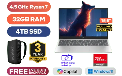 HP Laptop 15-fc0001ni AMD Ryzen 7 7730U up to 4.5GHz Processor with AMD Max Boost Clock Technology, 16MB Cache, 8x Cores, 16x Threads / 32GB DDR4 RAM / 4TB Ultra-Fast NVME SSD / 15.6" FHD 1920 x 1080 IPS Anti-Glare Display / Integrated AMD Radeon™ Graphics / Windows 11 Home 64bit / Realtek RTL8852BE-VS WiFi 6 Wireless LAN / Bluetooth 5.3 / 1 x USB 3.1 Type C / 2 x USB 3.1 Type-A / 1 x HDMI / Multi-format SD Card Reader / 1x Headphone And Microphone Combo Jack / HP True Vision 720p HD camera with integrated dual array digital microphones / Full-size Soft Grey Keyboard with Numeric Keypad / No DVD Drive Included / Supports battery fast charge: approximately 50% in 45 minutes / HP 15-fc0001ni 9J0C3EA Ryzen 7 LaptopHP Laptop 15-fc0001ni AMD Ryzen 7 7730U up to 4.5GHz Processor with AMD Max Boost Clock Technology, 16MB Cache, 8x Cores, 16x Threads / 32GB DDR4 RAM / 4TB Ultra-Fast NVME SSD / 15.6" FHD 1920 x 1080 IPS Anti-Glare Display / Integrated AMD Radeon™ Graphics / Windows 11 Home 64bit / Realtek RTL8852BE-VS WiFi 6 Wireless LAN / Bluetooth 5.3 / 1 x USB 3.1 Type C / 2 x USB 3.1 Type-A / 1 x HDMI / Multi-format SD Card Reader / 1x Headphone And Microphone Combo Jack / HP True Vision 720p HD camera with integrated dual array digital microphones / Full-size Soft Grey Keyboard with Numeric Keypad / No DVD Drive Included / Supports battery fast charge: approximately 50% in 45 minutes / HP 15-fc0001ni 9J0C3EA Ryzen 7 Laptop [9J0C3EA/32GB/4TB] / 3 YEARS WARRANTY / [+] GET FREE EVETECH NEO Premium Gaming Backpack+ FREE DELIVERY !