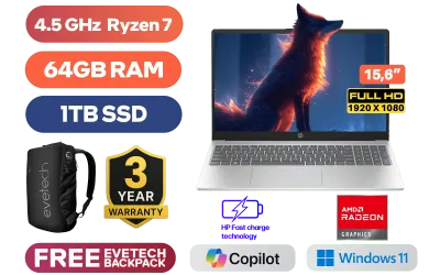 HP Laptop 15-fc0001ni AMD Ryzen 7 7730U up to 4.5GHz Processor with AMD Max Boost Clock Technology, 16MB Cache, 8x Cores, 16x Threads / 64GB DDR4 RAM / 1TB Ultra-Fast NVME SSD / 15.6" FHD 1920 x 1080 IPS Anti-Glare Display / Integrated AMD Radeon™ Graphics / Windows 11 Home 64bit / Realtek RTL8852BE-VS WiFi 6 Wireless LAN / Bluetooth 5.3 / 1 x USB 3.1 Type C / 2 x USB 3.1 Type-A / 1 x HDMI / Multi-format SD Card Reader / 1x Headphone And Microphone Combo Jack / HP True Vision 720p HD camera with integrated dual array digital microphones / Full-size Soft Grey Keyboard with Numeric Keypad / No DVD Drive Included / Supports battery fast charge: approximately 50% in 45 minutes / HP 15-fc0001ni 9J0C3EA Ryzen 7 LaptopHP Laptop 15-fc0001ni AMD Ryzen 7 7730U up to 4.5GHz Processor with AMD Max Boost Clock Technology, 16MB Cache, 8x Cores, 16x Threads / 64GB DDR4 RAM / 1TB Ultra-Fast NVME SSD / 15.6" FHD 1920 x 1080 IPS Anti-Glare Display / Integrated AMD Radeon™ Graphics / Windows 11 Home 64bit / Realtek RTL8852BE-VS WiFi 6 Wireless LAN / Bluetooth 5.3 / 1 x USB 3.1 Type C / 2 x USB 3.1 Type-A / 1 x HDMI / Multi-format SD Card Reader / 1x Headphone And Microphone Combo Jack / HP True Vision 720p HD camera with integrated dual array digital microphones / Full-size Soft Grey Keyboard with Numeric Keypad / No DVD Drive Included / Supports battery fast charge: approximately 50% in 45 minutes / HP 15-fc0001ni 9J0C3EA Ryzen 7 Laptop [9J0C3EA/64GB/1TB] / 3 YEARS WARRANTY / [+] GET FREE EVETECH NEO Premium Gaming Backpack+ FREE DELIVERY !