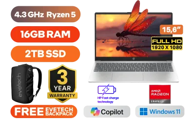 HP Laptop 15-fc0002ni AMD Ryzen 5 7520U up to 4.3GHz Processor with AMD Max Boost Clock Technology, 4MB Cache, 4x Cores, 8x Threads / 16GB LPDDR5 RAM / 2TB Ultra-Fast NVME SSD / 15.6" FHD 1920 x 1080 IPS Anti-Glare Display / Integrated AMD Radeon™ Graphics / Windows 11 Home 64bit / Realtek RTL8852BE-VS WiFi 6 Wireless LAN / Bluetooth 5.3 / 1 x USB 3.1 Type C / 2 x USB 3.1 Type-A / 1 x HDMI / 1x Headphone And Microphone Combo Jack / HP True Vision 720p HD camera with integrated dual array digital microphones / Full-size Soft Grey Keyboard with Numeric Keypad / HP 15-fc0002ni 9J3C2EA Ryzen 5 LaptopHP Laptop 15-fc0002ni AMD Ryzen 5 7520U up to 4.3GHz Processor with AMD Max Boost Clock Technology, 4MB Cache, 4x Cores, 8x Threads / 16GB LPDDR5 RAM / 2TB Ultra-Fast NVME SSD / 15.6" FHD 1920 x 1080 IPS Anti-Glare Display / Integrated AMD Radeon™ Graphics / Windows 11 Home 64bit / Realtek RTL8852BE-VS WiFi 6 Wireless LAN / Bluetooth 5.3 / 1 x USB 3.1 Type C / 2 x USB 3.1 Type-A / 1 x HDMI / 1x Headphone And Microphone Combo Jack / HP True Vision 720p HD camera with integrated dual array digital microphones / Full-size Soft Grey Keyboard with Numeric Keypad / HP 15-fc0002ni 9J3C2EA Ryzen 5 Laptop [9J3C2EA/2TB] / [+] GET FREE EVETECH NEO Premium Gaming Backpack / 3 YEARS WARRANTY / [+] GET FREE EVETECH NEO Premium Gaming Backpack / 3 YEARS WARRANTY + FREE DELIVERY !