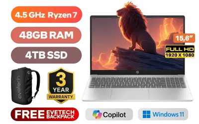 HP Laptop 15-fc0044ni AMD Ryzen 7 7730U up to 4.5GHz Processor, 20MB Cache, 8x Cores, 16x Threads / 48GB DDR4 RAM / 4TB Ultra-Fast NVME SSD / 15.6" FHD (1920 x 1080) Anti-Glare Display / Integrated AMD Radeon™ Graphics / Windows 11 Home 64bit / Realtek RTL8852BE-VT WiFi 6 Wireless LAN / Bluetooth 5.4 / HP True Vision 720p HD Web Camera / 2 x USB Type-A / 1 x USB Type-C / 1 x HDMI / 1x Headphone And Microphone Combo Jack / US Full-size Keyboard / Integrated Dual Speakers / HP 15-fc0044ni Ryzen 7 Laptop DealHP Laptop 15-fc0044ni AMD Ryzen 7 7730U up to 4.5GHz Processor, 20MB Cache, 8x Cores, 16x Threads / 48GB DDR4 RAM / 4TB Ultra-Fast NVME SSD / 15.6" FHD (1920 x 1080) Anti-Glare Display / Integrated AMD Radeon™ Graphics / Windows 11 Home 64bit / Realtek RTL8852BE-VT WiFi 6 Wireless LAN / Bluetooth 5.4 / HP True Vision 720p HD Web Camera / 2 x USB Type-A / 1 x USB Type-C / 1 x HDMI / 1x Headphone And Microphone Combo Jack / US Full-size Keyboard / Integrated Dual Speakers / HP 15-fc0044ni Ryzen 7 Laptop Deal [BZ1C4EA/48GB/4TB] / [+] GET FREE EVETECH NEO Premium Gaming Backpack / 3 YEARS WARRANTY + FREE DELIVERY !