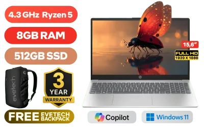 HP 15-fc0057ni AMD Ryzen 5 7520U up to 4.3GHz Processor, 6MB Cache, 4x Cores, 8x Threads / 8GB LPDDR5 RAM / 512GB Ultra-Fast NVME SSD / 15.6" FHD (1920 x 1080) Anti-Glare Display / Integrated AMD Radeon™ Graphics / Windows 11 Home 64bit / Realtek RTL8852BE-VT WiFi 6 Wireless LAN / Bluetooth 5.4 / 720p HP Web Camera / 2 x USB Type-A / 1 x USB Type-C / 1 x HDMI / 1x Headphone And Microphone Combo Jack / Full-size Keyboard / Dual Speakers / HP 15-fc0057ni Ryzen 5 Laptop DealHP 15-fc0057ni AMD Ryzen 5 7520U up to 4.3GHz Processor, 6MB Cache, 4x Cores, 8x Threads / 8GB LPDDR5 RAM / 512GB Ultra-Fast NVME SSD / 15.6" FHD (1920 x 1080) Anti-Glare Display / Integrated AMD Radeon™ Graphics / Windows 11 Home 64bit / Realtek RTL8852BE-VT WiFi 6 Wireless LAN / Bluetooth 5.4 / 720p HP Web Camera / 2 x USB Type-A / 1 x USB Type-C / 1 x HDMI / 1x Headphone And Microphone Combo Jack / Full-size Keyboard / Dual Speakers / HP 15-fc0057ni Ryzen 5 Laptop Deal [C29PMEA] / 3 YEARS WARRANTY / [+] GET FREE EVETECH DASH Premium Gaming Backpack+ FREE DELIVERY !