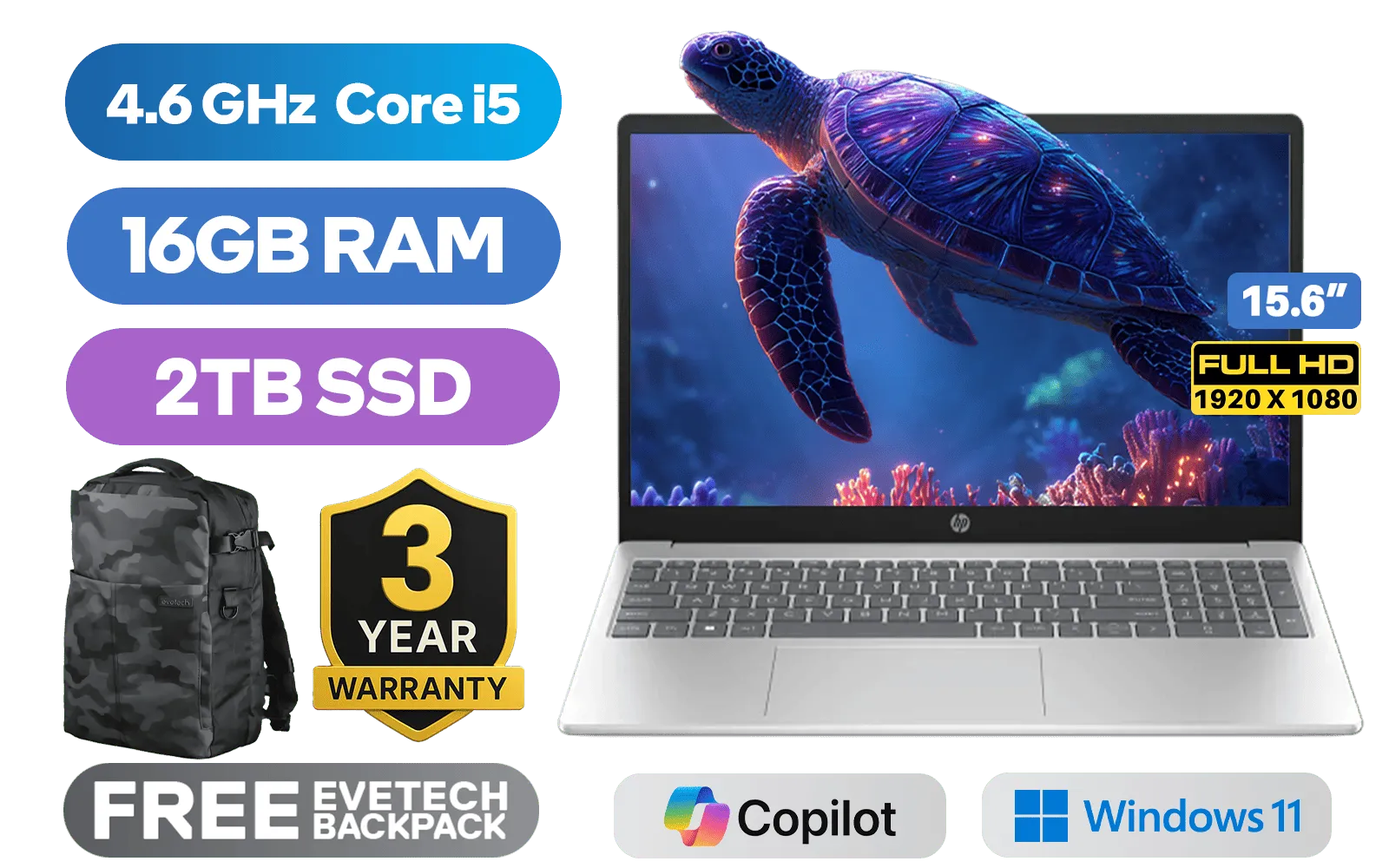 HP Laptop 15-fd0123ni 13th Gen Intel® Core™ i5-1334U up to 4.6GHz Processor, 12MB Cache, 10x Cores, 12x Threads / 16GB DDR4 RAM / 2TB Ultra-Fast NVME SSD / 15.6" FHD (1920x1080) Anti-Glare Display / Integrated Intel® Iris® Xe Graphics / Windows 11 Home 64bit / Realtek RTL8852BE-VT WiFi 6 Wireless LAN / Bluetooth 5.4 / 720p HD Camera / 2x USB Type-A / 1x USB Type-C / 1 x HDMI / 1x Headphone & Microphone Combo Jack / Dual speakers / Free 240 Bluetooth Mouse / Free HP Travel 18 Backpack / HP 15-fd0123ni Intel Core i5 LaptopHP Laptop 15-fd0123ni 13th Gen Intel® Core™ i5-1334U up to 4.6GHz Processor, 12MB Cache, 10x Cores, 12x Threads / 16GB DDR4 RAM / 2TB Ultra-Fast NVME SSD / 15.6" FHD (1920x1080) Anti-Glare Display / Integrated Intel® Iris® Xe Graphics / Windows 11 Home 64bit / Realtek RTL8852BE-VT WiFi 6 Wireless LAN / Bluetooth 5.4 / 720p HD Camera / 2x USB Type-A / 1x USB Type-C / 1 x HDMI / 1x Headphone & Microphone Combo Jack / Dual speakers / Free 240 Bluetooth Mouse / Free HP Travel 18 Backpack / HP 15-fd0123ni Intel Core i5 Laptop [C84HVEA/2TB] / 3 YEARS WARRANTY / [+] GET FREE EVETECH DASH Premium Gaming Backpack+ FREE DELIVERY !