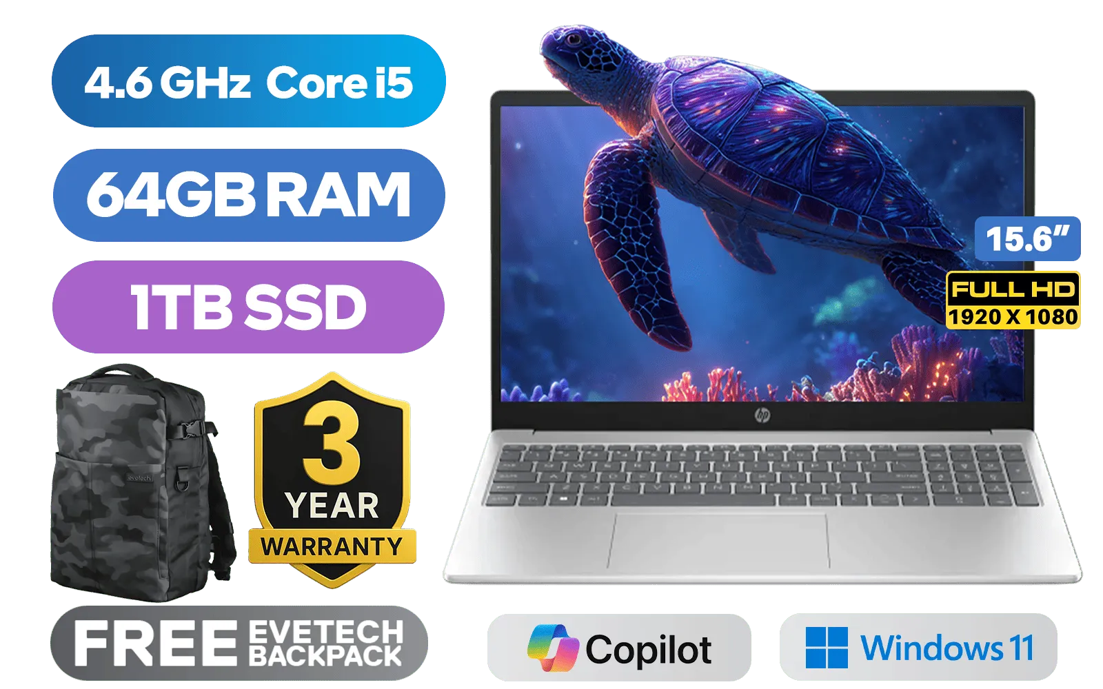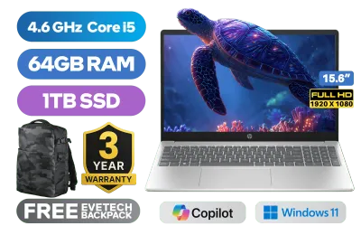HP Laptop 15-fd0123ni 13th Gen Intel® Core™ i5-1334U up to 4.6GHz Processor, 12MB Cache, 10x Cores, 12x Threads / 64GB DDR4 RAM / 1TB Ultra-Fast NVME SSD / 15.6" FHD (1920x1080) Anti-Glare Display / Integrated Intel® Iris® Xe Graphics / Windows 11 Home 64bit / Realtek RTL8852BE-VT WiFi 6 Wireless LAN / Bluetooth 5.4 / 720p HD Camera / 2x USB Type-A / 1x USB Type-C / 1 x HDMI / 1x Headphone & Microphone Combo Jack / Dual speakers / Free 240 Bluetooth Mouse / Free HP Travel 18 Backpack / HP 15-fd0123ni Intel Core i5 LaptopHP Laptop 15-fd0123ni 13th Gen Intel® Core™ i5-1334U up to 4.6GHz Processor, 12MB Cache, 10x Cores, 12x Threads / 64GB DDR4 RAM / 1TB Ultra-Fast NVME SSD / 15.6" FHD (1920x1080) Anti-Glare Display / Integrated Intel® Iris® Xe Graphics / Windows 11 Home 64bit / Realtek RTL8852BE-VT WiFi 6 Wireless LAN / Bluetooth 5.4 / 720p HD Camera / 2x USB Type-A / 1x USB Type-C / 1 x HDMI / 1x Headphone & Microphone Combo Jack / Dual speakers / Free 240 Bluetooth Mouse / Free HP Travel 18 Backpack / HP 15-fd0123ni Intel Core i5 Laptop [C84HVEA/64GB] / 3 YEARS WARRANTY / [+] GET FREE EVETECH DASH Premium Gaming Backpack+ FREE DELIVERY !