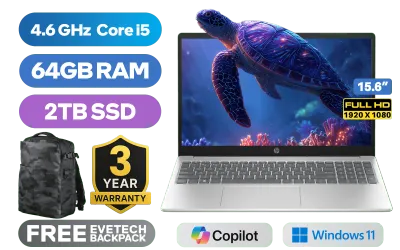 HP Laptop 15-fd0123ni 13th Gen Intel® Core™ i5-1334U up to 4.6GHz Processor, 12MB Cache, 10x Cores, 12x Threads / 64GB DDR4 RAM / 2TB Ultra-Fast NVME SSD / 15.6" FHD (1920x1080) Anti-Glare Display / Integrated Intel® Iris® Xe Graphics / Windows 11 Home 64bit / Realtek RTL8852BE-VT WiFi 6 Wireless LAN / Bluetooth 5.4 / 720p HD Camera / 2x USB Type-A / 1x USB Type-C / 1 x HDMI / 1x Headphone & Microphone Combo Jack / Dual speakers / Free 240 Bluetooth Mouse / Free HP Travel 18 Backpack / HP 15-fd0123ni Intel Core i5 LaptopHP Laptop 15-fd0123ni 13th Gen Intel® Core™ i5-1334U up to 4.6GHz Processor, 12MB Cache, 10x Cores, 12x Threads / 64GB DDR4 RAM / 2TB Ultra-Fast NVME SSD / 15.6" FHD (1920x1080) Anti-Glare Display / Integrated Intel® Iris® Xe Graphics / Windows 11 Home 64bit / Realtek RTL8852BE-VT WiFi 6 Wireless LAN / Bluetooth 5.4 / 720p HD Camera / 2x USB Type-A / 1x USB Type-C / 1 x HDMI / 1x Headphone & Microphone Combo Jack / Dual speakers / Free 240 Bluetooth Mouse / Free HP Travel 18 Backpack / HP 15-fd0123ni Intel Core i5 Laptop [C84HVEA/64GB/2TB] / 3 YEARS WARRANTY / [+] GET FREE EVETECH DASH Premium Gaming Backpack+ FREE DELIVERY !