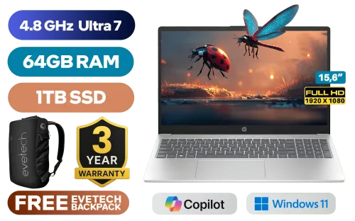 HP 15-fd1035ni Intel Core Ultra 7 155H up to 4.8GHz Processor, 24MB Cache, 16x Cores, 22x Threads / 64GB DDR5 RAM / 1TB Ultra-Fast NVME SSD / 15.6" FHD (1920 x 1080) Anti-Glare IPS-Level Display / Integrated Intel Arc Graphics / Windows 11 Home 64bit / Realtek RTL8852BE-VT WiFi 6 Wireless LAN / Bluetooth 5.4 / HD 720p Web Camera / 2 x USB Type-A / 1 x USB Type-C (Power Delivery, DisplayPort 1.4b) / 1 x HDMI / 1x Headphone And Microphone Combo Jack / Full-Size Keyboard / Dual Speakers / HP 15-fd1035ni Intel Core Ultra 7 Laptop DealHP 15-fd1035ni Intel Core Ultra 7 155H up to 4.8GHz Processor, 24MB Cache, 16x Cores, 22x Threads / 64GB DDR5 RAM / 1TB Ultra-Fast NVME SSD / 15.6" FHD (1920 x 1080) Anti-Glare IPS-Level Display / Integrated Intel Arc Graphics / Windows 11 Home 64bit / Realtek RTL8852BE-VT WiFi 6 Wireless LAN / Bluetooth 5.4 / HD 720p Web Camera / 2 x USB Type-A / 1 x USB Type-C (Power Delivery, DisplayPort 1.4b) / 1 x HDMI / 1x Headphone And Microphone Combo Jack / Full-Size Keyboard / Dual Speakers / HP 15-fd1035ni Intel Core Ultra 7 Laptop Deal [C38WVEA/64GB/1TB] / 3 YEARS WARRANTY / [+] GET FREE EVETECH NEO Premium Gaming Backpack+ FREE DELIVERY !
