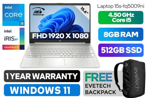HP Laptop 15s-fq5009ni 6G2Y3EA 12th Gen Intel Core i5-1235U up to 4.40GHz Processor, 12MB Cache, 10x Cores, 12x Threads / 8GB DDR4 RAM / 512GB Ultra-Fast NVME SSD / 15.6" FHD 1920 x 1080 Anti-Glare Display / Integrated Intel Iris Xe Graphics, DirectX 12 Support / Windows 11 Home 64bit / 802.11ac Wireless LAN / Bluetooth 4.2 / 1 x HDMI / 1 x USB Type C / 2 x USB Type-A / Multi-format SD Card Reader / 1x Headphone And Microphone Combo Jack / HP True Vision 720p HD camera with integrated dual array digital microphones / Full-size Natural Silver Keyboard with Numeric Keypadb - No Backlit / No DVD Drive Included / Up to 7 hours battery life / Supports battery fast charge: approximately 50% in 45 minutes / 1 Year Warranty / HP 15s-fq5009ni 6G2Y3EA 12th Gen Core i5 LaptopHP Laptop 15s-fq5009ni 6G2Y3EA 12th Gen Intel Core i5-1235U up to 4.40GHz Processor, 12MB Cache, 10x Cores, 12x Threads / 8GB DDR4 RAM / 512GB Ultra-Fast NVME SSD / 15.6" FHD 1920 x 1080 Anti-Glare Display / Integrated Intel Iris Xe Graphics, DirectX 12 Support / Windows 11 Home 64bit / 802.11ac Wireless LAN / Bluetooth 4.2 / 1 x HDMI / 1 x USB Type C / 2 x USB Type-A / Multi-format SD Card Reader / 1x Headphone And Microphone Combo Jack / HP True Vision 720p HD camera with integrated dual array digital microphones / Full-size Natural Silver Keyboard with Numeric Keypadb - No Backlit / No DVD Drive Included / Up to 7 hours battery life / Supports battery fast charge: approximately 50% in 45 minutes / 1 Year Warranty / HP 15s-fq5009ni 6G2Y3EA 12th Gen Core i5 Laptop [6G2Y3EA] / [+] GET FREE EVETECH NEO Premium Gaming Backpack+ FREE DELIVERY !