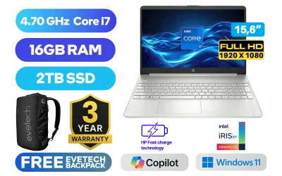 HP Laptop 15s-fq5017ni 8Y7B4EA 12th Gen Intel® Core™ i7-1255U up to 4.70GHz Processor, 12MB Cache, 10x Cores, 12x Threads / 16GB DDR4 RAM / 2TB Ultra-Fast NVME SSD / 15.6" FHD 1920 x 1080 Anti-Glare Display / Integrated Intel® Iris® Xe Graphics, DirectX 12 Support / Windows 11 Home 64bit / Dual Band Wireless LAN / Bluetooth / 2 x USB Type-A / 1 x USB Type C / 1 x HDMI / Multi-format SD Card Reader / 1x Headphone And Microphone Combo Jack / HP True Vision 720p HD Camera with integrated dual array digital microphones / Full-size Natural Silver Keyboard with Numeric Keypad - No Backlit / No DVD Drive Included / Supports battery fast charge: approximately 50% in 45 minutes / HP 15s-fq5017ni 12th Gen Intel® Core™ i7 Laptop DealHP Laptop 15s-fq5017ni 8Y7B4EA 12th Gen Intel® Core™ i7-1255U up to 4.70GHz Processor, 12MB Cache, 10x Cores, 12x Threads / 16GB DDR4 RAM / 2TB Ultra-Fast NVME SSD / 15.6" FHD 1920 x 1080 Anti-Glare Display / Integrated Intel® Iris® Xe Graphics, DirectX 12 Support / Windows 11 Home 64bit / Dual Band Wireless LAN / Bluetooth / 2 x USB Type-A / 1 x USB Type C / 1 x HDMI / Multi-format SD Card Reader / 1x Headphone And Microphone Combo Jack / HP True Vision 720p HD Camera with integrated dual array digital microphones / Full-size Natural Silver Keyboard with Numeric Keypad - No Backlit / No DVD Drive Included / Supports battery fast charge: approximately 50% in 45 minutes / HP 15s-fq5017ni 12th Gen Intel® Core™ i7 Laptop Deal [8Y7B4EA/16GB/2TB] / 3 YEARS WARRANTY / [+] GET FREE EVETECH NEO Premium Gaming Backpack+ FREE DELIVERY !