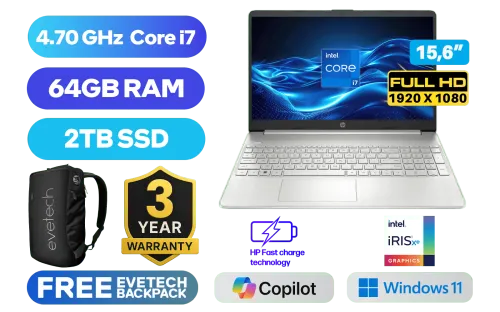 HP Laptop 15s-fq5017ni 8Y7B4EA 12th Gen Intel® Core™ i7-1255U up to 4.70GHz Processor, 12MB Cache, 10x Cores, 12x Threads / 64GB DDR4 RAM / 2TB Ultra-Fast NVME SSD / 15.6" FHD 1920 x 1080 Anti-Glare Display / Integrated Intel® Iris® Xe Graphics, DirectX 12 Support / Windows 11 Home 64bit / Dual Band Wireless LAN / Bluetooth / 2 x USB Type-A / 1 x USB Type C / 1 x HDMI / Multi-format SD Card Reader / 1x Headphone And Microphone Combo Jack / HP True Vision 720p HD Camera with integrated dual array digital microphones / Full-size Natural Silver Keyboard with Numeric Keypad - No Backlit / No DVD Drive Included / Supports battery fast charge: approximately 50% in 45 minutes / HP 15s-fq5017ni 12th Gen Intel® Core™ i7 Laptop DealHP Laptop 15s-fq5017ni 8Y7B4EA 12th Gen Intel® Core™ i7-1255U up to 4.70GHz Processor, 12MB Cache, 10x Cores, 12x Threads / 64GB DDR4 RAM / 2TB Ultra-Fast NVME SSD / 15.6" FHD 1920 x 1080 Anti-Glare Display / Integrated Intel® Iris® Xe Graphics, DirectX 12 Support / Windows 11 Home 64bit / Dual Band Wireless LAN / Bluetooth / 2 x USB Type-A / 1 x USB Type C / 1 x HDMI / Multi-format SD Card Reader / 1x Headphone And Microphone Combo Jack / HP True Vision 720p HD Camera with integrated dual array digital microphones / Full-size Natural Silver Keyboard with Numeric Keypad - No Backlit / No DVD Drive Included / Supports battery fast charge: approximately 50% in 45 minutes / HP 15s-fq5017ni 12th Gen Intel® Core™ i7 Laptop Deal [8Y7B4EA/64GB/2TB] / 3 YEARS WARRANTY / [+] GET FREE EVETECH NEO Premium Gaming Backpack+ FREE DELIVERY !