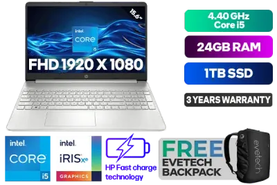 HP Laptop 15s-fq5018ni 12th Gen Intel® Core™ i5-1235U up to 4.40GHz Processor, 12MB Cache, 10x Cores, 12x Threads / 24GB DDR4 RAM / 1TB Ultra-Fast NVME SSD / 15.6" FHD 1920 x 1080 Anti-Glare Display / Integrated Intel® Iris® Xe Graphics, DirectX 12 Support / Windows 11 Home 64bit / Realtek 802.11ac Wireless LAN / Bluetooth 5 / 2x USB Type-A / 1x USB Type-C / 1 x HDMI / 1x SD Card Reader / 1x Headphone And Microphone Combo Jack / 720p HD camera / Full-size Natural Silver Keyboard / 2x 2W Speakers / HP 15s-fq5018ni 12th Gen Intel® Core™ i5 LaptopHP Laptop 15s-fq5018ni 12th Gen Intel® Core™ i5-1235U up to 4.40GHz Processor, 12MB Cache, 10x Cores, 12x Threads / 24GB DDR4 RAM / 1TB Ultra-Fast NVME SSD / 15.6" FHD 1920 x 1080 Anti-Glare Display / Integrated Intel® Iris® Xe Graphics, DirectX 12 Support / Windows 11 Home 64bit / Realtek 802.11ac Wireless LAN / Bluetooth 5 / 2x USB Type-A / 1x USB Type-C / 1 x HDMI / 1x SD Card Reader / 1x Headphone And Microphone Combo Jack / 720p HD camera / Full-size Natural Silver Keyboard / 2x 2W Speakers / HP 15s-fq5018ni 12th Gen Intel® Core™ i5 Laptop [8Y7B5EA/24GB/1TB] / 3 YEARS WARRANTY / [+] GET FREE EVETECH NEO Premium Gaming Backpack+ FREE DELIVERY !