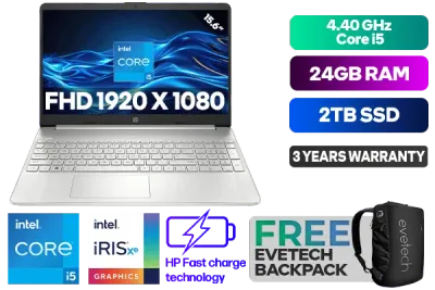 HP Laptop 15s-fq5018ni 12th Gen Intel® Core™ i5-1235U up to 4.40GHz Processor, 12MB Cache, 10x Cores, 12x Threads / 24GB DDR4 RAM / 2TB Ultra-Fast NVME SSD / 15.6" FHD 1920 x 1080 Anti-Glare Display / Integrated Intel® Iris® Xe Graphics, DirectX 12 Support / Windows 11 Home 64bit / Realtek 802.11ac Wireless LAN / Bluetooth 5 / 2x USB Type-A / 1x USB Type-C / 1 x HDMI / 1x SD Card Reader / 1x Headphone And Microphone Combo Jack / 720p HD camera / Full-size Natural Silver Keyboard / 2x 2W Speakers / HP 15s-fq5018ni 12th Gen Intel® Core™ i5 LaptopHP Laptop 15s-fq5018ni 12th Gen Intel® Core™ i5-1235U up to 4.40GHz Processor, 12MB Cache, 10x Cores, 12x Threads / 24GB DDR4 RAM / 2TB Ultra-Fast NVME SSD / 15.6" FHD 1920 x 1080 Anti-Glare Display / Integrated Intel® Iris® Xe Graphics, DirectX 12 Support / Windows 11 Home 64bit / Realtek 802.11ac Wireless LAN / Bluetooth 5 / 2x USB Type-A / 1x USB Type-C / 1 x HDMI / 1x SD Card Reader / 1x Headphone And Microphone Combo Jack / 720p HD camera / Full-size Natural Silver Keyboard / 2x 2W Speakers / HP 15s-fq5018ni 12th Gen Intel® Core™ i5 Laptop [8Y7B5EA/24GB/2TB] / 3 YEARS WARRANTY / [+] GET FREE EVETECH NEO Premium Gaming Backpack+ FREE DELIVERY !