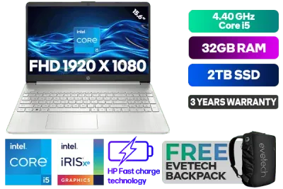 HP Laptop 15s-fq5018ni 12th Gen Intel® Core™ i5-1235U up to 4.40GHz Processor, 12MB Cache, 10x Cores, 12x Threads / 32GB DDR4 RAM / 2TB Ultra-Fast NVME SSD / 15.6" FHD 1920 x 1080 Anti-Glare Display / Integrated Intel® Iris® Xe Graphics, DirectX 12 Support / Windows 11 Home 64bit / Realtek 802.11ac Wireless LAN / Bluetooth 5 / 2x USB Type-A / 1x USB Type-C / 1 x HDMI / 1x SD Card Reader / 1x Headphone And Microphone Combo Jack / 720p HD camera / Full-size Natural Silver Keyboard / 2x 2W Speakers / HP 15s-fq5018ni 12th Gen Intel® Core™ i5 LaptopHP Laptop 15s-fq5018ni 12th Gen Intel® Core™ i5-1235U up to 4.40GHz Processor, 12MB Cache, 10x Cores, 12x Threads / 32GB DDR4 RAM / 2TB Ultra-Fast NVME SSD / 15.6" FHD 1920 x 1080 Anti-Glare Display / Integrated Intel® Iris® Xe Graphics, DirectX 12 Support / Windows 11 Home 64bit / Realtek 802.11ac Wireless LAN / Bluetooth 5 / 2x USB Type-A / 1x USB Type-C / 1 x HDMI / 1x SD Card Reader / 1x Headphone And Microphone Combo Jack / 720p HD camera / Full-size Natural Silver Keyboard / 2x 2W Speakers / HP 15s-fq5018ni 12th Gen Intel® Core™ i5 Laptop [8Y7B5EA/32GB/2TB] / 3 YEARS WARRANTY / [+] GET FREE EVETECH NEO Premium Gaming Backpack+ FREE DELIVERY !