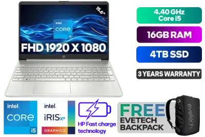 HP Laptop 15s-fq5018ni 12th Gen Intel® Core™ i5-1235U up to 4.40GHz Processor, 12MB Cache, 10x Cores, 12x Threads / 16GB DDR4 RAM / 4TB Ultra-Fast NVME SSD / 15.6" FHD 1920 x 1080 Anti-Glare Display / Integrated Intel® Iris® Xe Graphics, DirectX 12 Support / Windows 11 Home 64bit / Realtek 802.11ac Wireless LAN / Bluetooth 5 / 2x USB Type-A / 1x USB Type-C / 1 x HDMI / 1x SD Card Reader / 1x Headphone And Microphone Combo Jack / 720p HD camera / Full-size Natural Silver Keyboard / 2x 2W Speakers / HP 15s-fq5018ni 12th Gen Intel® Core™ i5 LaptopHP Laptop 15s-fq5018ni 12th Gen Intel® Core™ i5-1235U up to 4.40GHz Processor, 12MB Cache, 10x Cores, 12x Threads / 16GB DDR4 RAM / 4TB Ultra-Fast NVME SSD / 15.6" FHD 1920 x 1080 Anti-Glare Display / Integrated Intel® Iris® Xe Graphics, DirectX 12 Support / Windows 11 Home 64bit / Realtek 802.11ac Wireless LAN / Bluetooth 5 / 2x USB Type-A / 1x USB Type-C / 1 x HDMI / 1x SD Card Reader / 1x Headphone And Microphone Combo Jack / 720p HD camera / Full-size Natural Silver Keyboard / 2x 2W Speakers / HP 15s-fq5018ni 12th Gen Intel® Core™ i5 Laptop [8Y7B5EA/4TB] / 3 YEARS WARRANTY / [+] GET FREE EVETECH NEO Premium Gaming Backpack+ FREE DELIVERY !