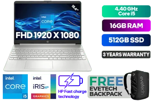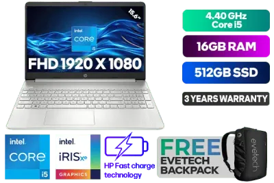 HP Laptop 15s-fq5018ni 12th Gen Intel® Core™ i5-1235U up to 4.40GHz Processor, 12MB Cache, 10x Cores, 12x Threads / 16GB DDR4 RAM / 512GB Ultra-Fast NVME SSD / 15.6" FHD 1920 x 1080 Anti-Glare Display / Integrated Intel® Iris® Xe Graphics, DirectX 12 Support / Windows 11 Home 64bit / Realtek 802.11ac Wireless LAN / Bluetooth 5 / 2x USB Type-A / 1x USB Type-C / 1 x HDMI / 1x SD Card Reader / 1x Headphone And Microphone Combo Jack / 720p HD camera / Full-size Natural Silver Keyboard / 2x 2W Speakers / HP 15s-fq5018ni 12th Gen Intel® Core™ i5 Laptop DealHP Laptop 15s-fq5018ni 12th Gen Intel® Core™ i5-1235U up to 4.40GHz Processor, 12MB Cache, 10x Cores, 12x Threads / 16GB DDR4 RAM / 512GB Ultra-Fast NVME SSD / 15.6" FHD 1920 x 1080 Anti-Glare Display / Integrated Intel® Iris® Xe Graphics, DirectX 12 Support / Windows 11 Home 64bit / Realtek 802.11ac Wireless LAN / Bluetooth 5 / 2x USB Type-A / 1x USB Type-C / 1 x HDMI / 1x SD Card Reader / 1x Headphone And Microphone Combo Jack / 720p HD camera / Full-size Natural Silver Keyboard / 2x 2W Speakers / HP 15s-fq5018ni 12th Gen Intel® Core™ i5 Laptop Deal [8Y7B5EA] / 3 YEARS WARRANTY / [+] GET FREE EVETECH NEO Premium Gaming Backpack+ FREE DELIVERY !