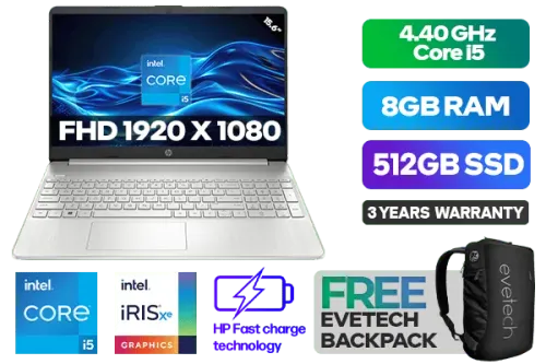 HP Laptop 15s-fq5019ni 8Y7B6EA 12th Gen Intel® Core™ i5-1235U up to 4.40GHz Processor, 12MB Cache, 10x Cores, 12x Threads / 8GB DDR4 RAM / 512GB Ultra-Fast NVME SSD / 15.6" FHD 1920 x 1080 Anti-Glare Display / Integrated Intel® Iris® Xe Graphics, DirectX 12 Support / Windows 11 Home 64bit / 802.11ac Wireless LAN / Bluetooth / 2 x USB Type-A / 1 x USB Type C / 1 x HDMI / Multi-format SD Card Reader / 1x Headphone And Microphone Combo Jack / HP True Vision 720p HD camera with integrated dual array digital microphones / Full-size Natural Silver Keyboard with Numeric Keypad - No Backlit / No DVD Drive Included / Supports battery fast charge: approximately 50% in 45 minutes / HP 15s-fq5019ni 8Y7B6EA 12th Gen Intel® Core™ i5 LaptopHP Laptop 15s-fq5019ni 8Y7B6EA 12th Gen Intel® Core™ i5-1235U up to 4.40GHz Processor, 12MB Cache, 10x Cores, 12x Threads / 8GB DDR4 RAM / 512GB Ultra-Fast NVME SSD / 15.6" FHD 1920 x 1080 Anti-Glare Display / Integrated Intel® Iris® Xe Graphics, DirectX 12 Support / Windows 11 Home 64bit / 802.11ac Wireless LAN / Bluetooth / 2 x USB Type-A / 1 x USB Type C / 1 x HDMI / Multi-format SD Card Reader / 1x Headphone And Microphone Combo Jack / HP True Vision 720p HD camera with integrated dual array digital microphones / Full-size Natural Silver Keyboard with Numeric Keypad - No Backlit / No DVD Drive Included / Supports battery fast charge: approximately 50% in 45 minutes / HP 15s-fq5019ni 8Y7B6EA 12th Gen Intel® Core™ i5 Laptop [8Y7B6EA] / 3 YEARS WARRANTY / [+] GET FREE EVETECH NEO Premium Gaming Backpack+ FREE DELIVERY !