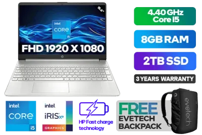 HP Laptop 15s-fq5019ni 8Y7B6EA 12th Gen Intel® Core⢠i5-1235U up to 4.40GHz Processor, 12MB Cache, 10x Cores, 12x Threads / 8GB DDR4 RAM / 2TB Ultra-Fast NVME SSD / 15.6" FHD 1920 x 1080 Anti-Glare Display / Integrated Intel® Iris® Xe Graphics, DirectX 12 Support / Windows 11 Home 64bit / 802.11ac Wireless LAN / Bluetooth / 2 x USB Type-A / 1 x USB Type C / 1 x HDMI / Multi-format SD Card Reader / 1x Headphone And Microphone Combo Jack / HP True Vision 720p HD camera with integrated dual array digital microphones / Full-size Natural Silver Keyboard with Numeric Keypad - No Backlit / No DVD Drive Included / Supports battery fast charge: approximately 50% in 45 minutes / HP 15s-fq5019ni 8Y7B6EA 12th Gen Intel® Core⢠i5 LaptopHP Laptop 15s-fq5019ni 8Y7B6EA 12th Gen Intel® Core⢠i5-1235U up to 4.40GHz Processor, 12MB Cache, 10x Cores, 12x Threads / 8GB DDR4 RAM / 2TB Ultra-Fast NVME SSD / 15.6" FHD 1920 x 1080 Anti-Glare Display / Integrated Intel® Iris® Xe Graphics, DirectX 12 Support / Windows 11 Home 64bit / 802.11ac Wireless LAN / Bluetooth / 2 x USB Type-A / 1 x USB Type C / 1 x HDMI / Multi-format SD Card Reader / 1x Headphone And Microphone Combo Jack / HP True Vision 720p HD camera with integrated dual array digital microphones / Full-size Natural Silver Keyboard with Numeric Keypad - No Backlit / No DVD Drive Included / Supports battery fast charge: approximately 50% in 45 minutes / HP 15s-fq5019ni 8Y7B6EA 12th Gen Intel® Core⢠i5 Laptop [8Y7B6EA/2TB] / 3 YEARS WARRANTY / [+] GET FREE EVETECH NEO Premium Gaming Backpack+ FREE DELIVERY !