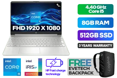 HP Laptop 15s-fq5019ni 8Y7B6EA 12th Gen Intel® Core™ i5-1235U up to 4.40GHz Processor, 12MB Cache, 10x Cores, 12x Threads / 8GB DDR4 RAM / 512GB Ultra-Fast NVME SSD / 15.6" FHD 1920 x 1080 Anti-Glare Display / Integrated Intel® Iris® Xe Graphics, DirectX 12 Support / Windows 11 Home 64bit / 802.11ac Wireless LAN / Bluetooth / 2 x USB Type-A / 1 x USB Type C / 1 x HDMI / Multi-format SD Card Reader / 1x Headphone And Microphone Combo Jack / HP True Vision 720p HD camera with integrated dual array digital microphones / Full-size Natural Silver Keyboard with Numeric Keypad - No Backlit / No DVD Drive Included / Supports battery fast charge: approximately 50% in 45 minutes / HP 15s-fq5019ni 8Y7B6EA 12th Gen Intel® Core™ i5 LaptopHP Laptop 15s-fq5019ni 8Y7B6EA 12th Gen Intel® Core™ i5-1235U up to 4.40GHz Processor, 12MB Cache, 10x Cores, 12x Threads / 8GB DDR4 RAM / 512GB Ultra-Fast NVME SSD / 15.6" FHD 1920 x 1080 Anti-Glare Display / Integrated Intel® Iris® Xe Graphics, DirectX 12 Support / Windows 11 Home 64bit / 802.11ac Wireless LAN / Bluetooth / 2 x USB Type-A / 1 x USB Type C / 1 x HDMI / Multi-format SD Card Reader / 1x Headphone And Microphone Combo Jack / HP True Vision 720p HD camera with integrated dual array digital microphones / Full-size Natural Silver Keyboard with Numeric Keypad - No Backlit / No DVD Drive Included / Supports battery fast charge: approximately 50% in 45 minutes / HP 15s-fq5019ni 8Y7B6EA 12th Gen Intel® Core™ i5 Laptop [8Y7B6EA] / 3 YEARS WARRANTY / [+] GET FREE EVETECH NEO Premium Gaming Backpack+ FREE DELIVERY !