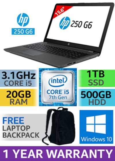 HP 250 G6 Intel 7th Gen Kabylake Core i5-7200U up to 3.10GHz Processor / 20GB DDR4 RAM / 1TB Ultra-Fast SSD + 500GB Hard Drive / 15.6" FULL HD 1920 x 1080 Anti-Glare LED-backlit Display / Integrated Intel HD Graphics 620 / DVD Writer / Intel Dual Band 802.11ac Wireless LAN / Bluetooth 4.2 / SD Card Reader / HD Web Camera / Windows 10 Home 64bit / 2x USB 3.0 / 1x USB 2.0 / 1x HDMI / 1x VGA Port / 1x Audio In And Out Combo / Full-Size Island Style Keyboard / 2x Integrated Stereo Speakers / 1 Year HP Warranty / FREE Backpack / HP 250 G6 7th Generation Core i5 Laptop Deal