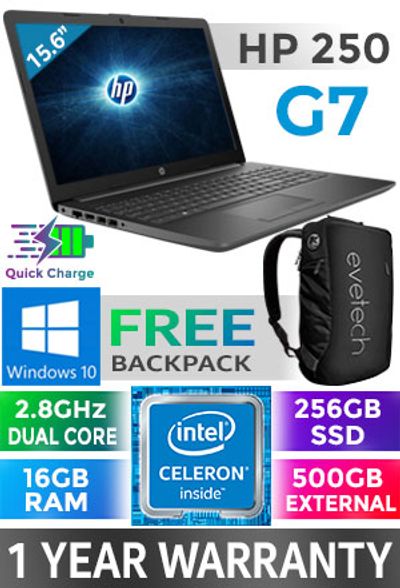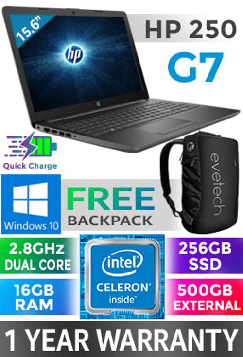 HP 250 G7 Intel Celeron Dual Core N4020 up to 2.80GHz Processor, 4MB Cache, 2x Cores, 2x Threads / 16GB DDR4 RAM / 256GB Ultra-Fast SSD + 500GB External Hard Drive / 15.6" HD 1366 x 768 Anti-Glare LED-backlit Display / Integrated Intel UHD Graphics 600 / Windows 10 Home 64bit / DVD Writer / Realtek RTL8821CE 802.11ac Wireless LAN / Bluetooth 4.2 / SD Card Reader / VGA Web Camera / 1x USB 2.0 / 2x USB 3.1 / 1x HDMI / 1x Audio In And Out Combo / Full-Size Island Style Keyboard / 2x Integrated Stereo Speakers / 1 Year Warranty / HP 250 G7 15.6" Intel Dual Core Laptop DealHP 250 G7 Intel Celeron Dual Core N4020 up to 2.80GHz Processor, 4MB Cache, 2x Cores, 2x Threads / 16GB DDR4 RAM / 256GB Ultra-Fast SSD + 500GB External Hard Drive / 15.6" HD 1366 x 768 Anti-Glare LED-backlit Display / Integrated Intel UHD Graphics 600 / Windows 10 Home 64bit / DVD Writer / Realtek RTL8821CE 802.11ac Wireless LAN / Bluetooth 4.2 / SD Card Reader / VGA Web Camera / 1x USB 2.0 / 2x USB 3.1 / 1x HDMI / 1x Audio In And Out Combo / Full-Size Island Style Keyboard / 2x Integrated Stereo Speakers / 1 Year Warranty / HP 250 G7 15.6" Intel Dual Core Laptop Deal [1L3M4EA/16GB/256GB] / [+] GET FREE EVETECH NEO Premium Gaming Backpack