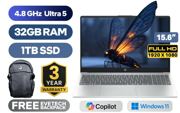 HP laptop AI 15-fd2009ni Intel Core Ultra 5-225U up to 4.8GHz, 12MB Cache Processor, 12x Cores, 14x Threads / 32GB DDR5 RAM / 1TB Ultra-Fast NVME SSD / 15.6" FHD (1920x1080) Anti-glare Display / Integrated Intel® Graphics / Windows 11 Home (64bit) / RealTek WiFi 6 8852BE-VT Wireless LAN / Bluetooth 5.4 / 1080p FHD Camera / 2x USB Type-A / 1x USB Type-C (Supports DisplayPort 2.1 / Power Delivery 3.1) / 1x HDMI / 1x Microphone and Headphone Combo Jack / Dual Speakers / HP laptop AI 15 Core Ultra 5 DealHP laptop AI 15-fd2009ni Intel Core Ultra 5-225U up to 4.8GHz, 12MB Cache Processor, 12x Cores, 14x Threads / 32GB DDR5 RAM / 1TB Ultra-Fast NVME SSD / 15.6" FHD (1920x1080) Anti-glare Display / Integrated Intel® Graphics / Windows 11 Home (64bit) / RealTek WiFi 6 8852BE-VT Wireless LAN / Bluetooth 5.4 / 1080p FHD Camera / 2x USB Type-A / 1x USB Type-C (Supports DisplayPort 2.1 / Power Delivery 3.1) / 1x HDMI / 1x Microphone and Headphone Combo Jack / Dual Speakers / HP laptop AI 15 Core Ultra 5 Deal [D34JVEA/32GB/1TB] / 3 YEARS WARRANTY / [+] GET FREE EVETECH FLUX Premium Gaming Backpack+ FREE DELIVERY !