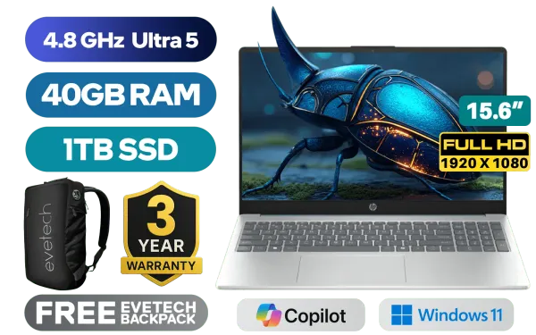 HP laptop AI 15-fd2009ni Intel Core Ultra 5-225U up to 4.8GHz, 12MB Cache Processor, 12x Cores, 14x Threads / 40GB DDR5 RAM / 1TB Ultra-Fast NVME SSD / 15.6" FHD (1920x1080) Anti-glare Display / Integrated Intel® Graphics / Windows 11 Home (64bit) / RealTek WiFi 6 8852BE-VT Wireless LAN / Bluetooth 5.4 / 1080p FHD Camera / 2x USB Type-A / 1x USB Type-C (Supports DisplayPort 2.1 / Power Delivery 3.1) / 1x HDMI / 1x Microphone and Headphone Combo Jack / Dual Speakers / HP laptop AI 15 Core Ultra 5 DealHP laptop AI 15-fd2009ni Intel Core Ultra 5-225U up to 4.8GHz, 12MB Cache Processor, 12x Cores, 14x Threads / 40GB DDR5 RAM / 1TB Ultra-Fast NVME SSD / 15.6" FHD (1920x1080) Anti-glare Display / Integrated Intel® Graphics / Windows 11 Home (64bit) / RealTek WiFi 6 8852BE-VT Wireless LAN / Bluetooth 5.4 / 1080p FHD Camera / 2x USB Type-A / 1x USB Type-C (Supports DisplayPort 2.1 / Power Delivery 3.1) / 1x HDMI / 1x Microphone and Headphone Combo Jack / Dual Speakers / HP laptop AI 15 Core Ultra 5 Deal [D34JTEA/40GB/1TB] / 3 YEARS WARRANTY / [+] GET FREE EVETECH NEO Premium Gaming Backpack+ FREE DELIVERY !