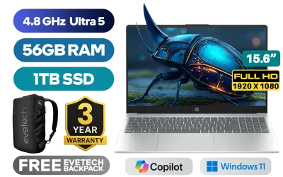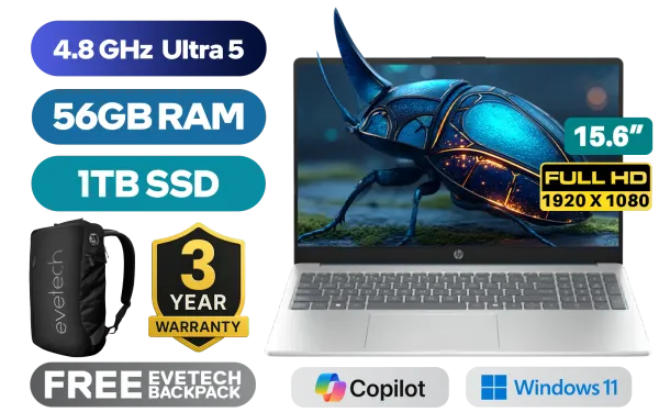 HP laptop AI 15-fd2009ni Intel Core Ultra 5-225U up to 4.8GHz, 12MB Cache Processor, 12x Cores, 14x Threads / 56GB DDR5 RAM / 1TB Ultra-Fast NVME SSD / 15.6" FHD (1920x1080) Anti-glare Display / Integrated Intel® Graphics / Windows 11 Home (64bit) / RealTek WiFi 6 8852BE-VT Wireless LAN / Bluetooth 5.4 / 1080p FHD Camera / 2x USB Type-A / 1x USB Type-C (Supports DisplayPort 2.1 / Power Delivery 3.1) / 1x HDMI / 1x Microphone and Headphone Combo Jack / Dual Speakers / HP laptop AI 15 Core Ultra 5 DealHP laptop AI 15-fd2009ni Intel Core Ultra 5-225U up to 4.8GHz, 12MB Cache Processor, 12x Cores, 14x Threads / 56GB DDR5 RAM / 1TB Ultra-Fast NVME SSD / 15.6" FHD (1920x1080) Anti-glare Display / Integrated Intel® Graphics / Windows 11 Home (64bit) / RealTek WiFi 6 8852BE-VT Wireless LAN / Bluetooth 5.4 / 1080p FHD Camera / 2x USB Type-A / 1x USB Type-C (Supports DisplayPort 2.1 / Power Delivery 3.1) / 1x HDMI / 1x Microphone and Headphone Combo Jack / Dual Speakers / HP laptop AI 15 Core Ultra 5 Deal [D34JTEA/56GB/1TB] / 3 YEARS WARRANTY / [+] GET FREE EVETECH NEO Premium Gaming Backpack+ FREE DELIVERY !