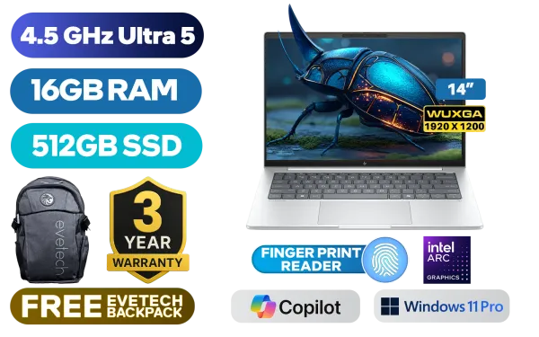 HP EliteBook 8 G1i Intel® Core™ Ultra 5-226V up to 4.5GHz Processor, 8MB Cache, 8x Cores, 8x Threads / 16GB LPDDR5X RAM / 512GB Ultra-Fast NVME SSD / 14" WUXGA (1920 x 1200) Anti-Glare IPS-Level Display / Integrated Intel™ Arc Graphics / <span style="font-size: 20px; color: #00BFFF; font-weight: bold;">Windows 11 Professional (64bit)</span> / Intel WiFi 7 BE201 Wireless LAN / Bluetooth 5.4 / 5MP IR AI Camera / 2 x USB Type-A / 3 x USB Type C (Thunderbolt™ 4 / Power Delivery / DisplayPort™) / 1 x HDMI / 1x Headphone And Microphone Combo Jack / White Backlit Keyboard / Poly Studio Dual Stereo Speakers / Fingerprint / HP EliteBook 8 G1i Intel® Core™ Ultra 5 LaptopHP EliteBook 8 G1i Intel® Core™ Ultra 5-226V up to 4.5GHz Processor, 8MB Cache, 8x Cores, 8x Threads / 16GB LPDDR5X RAM / 512GB Ultra-Fast NVME SSD / 14" WUXGA (1920 x 1200) Anti-Glare IPS-Level Display / Integrated Intel™ Arc Graphics / Windows 11 Professional (64bit) / Intel WiFi 7 BE201 Wireless LAN / Bluetooth 5.4 / 5MP IR AI Camera / 2 x USB Type-A / 3 x USB Type C (Thunderbolt™ 4 / Power Delivery / DisplayPort™) / 1 x HDMI / 1x Headphone And Microphone Combo Jack / White Backlit Keyboard / Poly Studio Dual Stereo Speakers / Fingerprint / HP EliteBook 8 G1i Intel® Core™ Ultra 5 Laptop [AD3U1ET] / 3 YEARS WARRANTY / [+] GET FREE EVETECH FLUX Premium Gaming Backpack+ FREE DELIVERY !