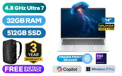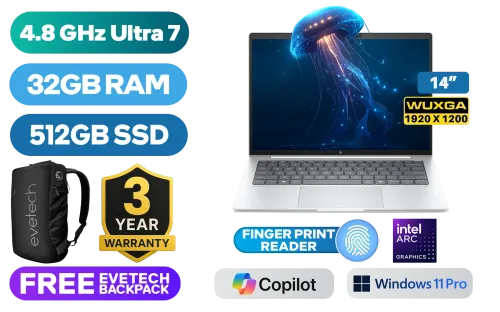 HP EliteBook 8 Intel® Core™ Ultra 7-258V up to 4.8GHz Processor, 12MB Cache, 8x Cores, 8x Threads / 32GB LPDDR5X RAM / 512GB Ultra-Fast NVME SSD / 14" WUXGA (1920 x 1200) IPS Anti-Glare Display / Integrated Intel™ Arc Graphics / <span style="font-size: 20px; color: #00BFFF; font-weight: bold;">Windows 11 Professional (64bit)</span> / Intel WiFi 7 BE201 Wireless LAN / Bluetooth 5.4 / 5 MP IR AI camera / 2 x USB Type-A / 3 x USB Type C (Thunderbolt™ 4 , Power Delivery, DisplayPort™ 2.1) / 1 x HDMI / 1x Headphone And Microphone Combo Jack / White Backlit Keyboard / Poly Studio Dual Stereo Speakers / Fingerprint / HP EliteBook 8 Intel® Core™ Ultra 7 LaptopHP EliteBook 8 Intel® Core™ Ultra 7-258V up to 4.8GHz Processor, 12MB Cache, 8x Cores, 8x Threads / 32GB LPDDR5X RAM / 512GB Ultra-Fast NVME SSD / 14" WUXGA (1920 x 1200) IPS Anti-Glare Display / Integrated Intel™ Arc Graphics / Windows 11 Professional (64bit) / Intel WiFi 7 BE201 Wireless LAN / Bluetooth 5.4 / 5 MP IR AI camera / 2 x USB Type-A / 3 x USB Type C (Thunderbolt™ 4 , Power Delivery, DisplayPort™ 2.1) / 1 x HDMI / 1x Headphone And Microphone Combo Jack / White Backlit Keyboard / Poly Studio Dual Stereo Speakers / Fingerprint / HP EliteBook 8 Intel® Core™ Ultra 7 Laptop [AD3U2ET] / [+] GET FREE EVETECH NEO Premium Gaming Backpack / 3 YEARS WARRANTY + FREE DELIVERY !