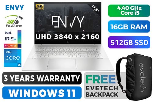 <span style="font-size:18px; color:red;">[4K]</span> HP ENVY 17-cr0001ni 6C620EA 12th Gen Intel Core i5-1240P up to 4.4GHz Processor, 12MB L3 Cache, 12x Cores, 16x Threads / 16GB DDR4 RAM / 512GB Ultra-Fast NVMe SSD / 17.3" 4K UHD (3840 x 2160) micro-edge IPS Low Blue Light Screen / Integrated Intel Iris Xe Graphics / Windows 11 Home 64bit / Dual Band Wi-Fi 6E AX211 Wireless LAN / Bluetooth 5.2 / HP True Vision 5MP IR camera with camera shutter, temporal noise reduction and integrated dual array digital microphones / 2x USB Type-C (Thunderbolt 4, DisplayPort 1.4) / 3x USB Type-A / 1 HDMI 2.1 / 1x Headphone and Microphone Combo Jack / 1x SD Card Reader / No DVD Drive Included / White Backlit Keyboard / Bang & Olufsen 2 speakers HP Audio Boost / Up to 8 hours and 45 minutes / Supports battery fast charge: approximately 50% in 30 minutes / HP ENVY 17-cr0001ni 12th Gen Core i5 Professional Laptop Deal[4K] HP ENVY 17-cr0001ni 6C620EA 12th Gen Intel Core i5-1240P up to 4.4GHz Processor, 12MB L3 Cache, 12x Cores, 16x Threads / 16GB DDR4 RAM / 512GB Ultra-Fast NVMe SSD / 17.3" 4K UHD (3840 x 2160) micro-edge IPS Low Blue Light Screen / Integrated Intel Iris Xe Graphics / Windows 11 Home 64bit / Dual Band Wi-Fi 6E AX211 Wireless LAN / Bluetooth 5.2 / HP True Vision 5MP IR camera with camera shutter, temporal noise reduction and integrated dual array digital microphones / 2x USB Type-C (Thunderbolt 4, DisplayPort 1.4) / 3x USB Type-A / 1 HDMI 2.1 / 1x Headphone and Microphone Combo Jack / 1x SD Card Reader / No DVD Drive Included / White Backlit Keyboard / Bang & Olufsen 2 speakers HP Audio Boost / Up to 8 hours and 45 minutes / Supports battery fast charge: approximately 50% in 30 minutes / HP ENVY 17-cr0001ni 12th Gen Core i5 Professional Laptop Deal [6C620EA] / 3 YEARS WARRANTY / [+] GET FREE EVETECH NEO Premium Gaming Backpack+ FREE DELIVERY !