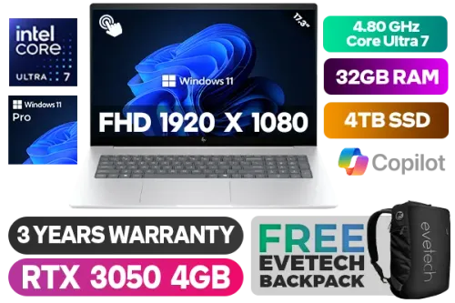 [TOUCHSCREEN] HP Envy 2-in-1 Laptop 17-da0000ni Intel Core Ultra 7-155U up to 4.8GHz Processor, 12MB Cache, 12x Cores, 14x Threads / 32GB DDR5 RAM / 4TB Ultra-Fast NVMe SSD / 17.3" FHD (1920 x 1080), Micro-edge Touchscreen Display / NVIDIA GeForce RTX 3050 4GB GDDR6 Dedicated Graphics / <span style="font-size: 20px; color: #00BFFF; font-weight: bold;">Windows 11 Professional (64bit)</span> / Dual Band Wi-Fi 7 BE200 Wireless LAN / Bluetooth 5.4 / HP Wide Vision 5MP IR camera with camera shutter, temporal noise reduction and integrated dual array digital microphones / 3x USB Type-A / 2x USB Type-C (USB Power Delivery, DisplayPort™ 2.1, HP Sleep and Charge) / 1x HDMI / 1x Headphone and Microphone Combo Jack / No DVD Drive Included / White Backlit Keyboard / Audio by DTS:X® Ultra HP Audio Boost / HP Envy Intel Core Ultra 7 Touchscreen Laptop Deal[TOUCHSCREEN] HP Envy 2-in-1 Laptop 17-da0000ni Intel Core Ultra 7-155U up to 4.8GHz Processor, 12MB Cache, 12x Cores, 14x Threads / 32GB DDR5 RAM / 4TB Ultra-Fast NVMe SSD / 17.3" FHD (1920 x 1080), Micro-edge Touchscreen Display / NVIDIA GeForce RTX 3050 4GB GDDR6 Dedicated Graphics / Windows 11 Professional (64bit) / Dual Band Wi-Fi 7 BE200 Wireless LAN / Bluetooth 5.4 / HP Wide Vision 5MP IR camera with camera shutter, temporal noise reduction and integrated dual array digital microphones / 3x USB Type-A / 2x USB Type-C (USB Power Delivery, DisplayPort™ 2.1, HP Sleep and Charge) / 1x HDMI / 1x Headphone and Microphone Combo Jack / No DVD Drive Included / White Backlit Keyboard / Audio by DTS:X® Ultra HP Audio Boost / HP Envy Intel Core Ultra 7 Touchscreen Laptop Deal [A7JH1EA/32GB/4TB] / 3 YEARS WARRANTY / [+] GET FREE EVETECH NEO Premium Gaming Backpack+ FREE DELIVERY !