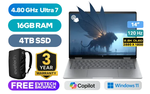 [TOUCHSCREEN] HP Envy x360 2-in-1 Laptop 14-fc0015ni Intel® Core™ Ultra 7-155U up to 4.8GHz Processor, 12MB Cache, 12x Cores, 14x Threads / 16GB LPDDR5 RAM / 4TB Ultra-Fast NVMe SSD / 14" 2.8K (2880 x 1800) 120Hz, Micro-edge OLED Touchscreen Display / Integrated Intel Graphics / Windows 11 Home (64bit) / Dual Band Wi-Fi 7 BE200 Wireless LAN / Bluetooth 5.4 / HP Wide Vision 5MP IR camera with camera shutter, temporal noise reduction and integrated dual array digital microphones / 2x USB Type-A / 2x USB Type-C (USB Power Delivery, DisplayPort™ 2.1, HP Sleep and Charge) / 1x Headphone and Microphone Combo Jack / 1x HDMI / White Backlit Keyboard / Audio by DTS:X® Ultra HP Audio Boost / HP Envy x360 2-in-1 Intel Core Ultra 7 Touchscreen Laptop Deal[TOUCHSCREEN] HP Envy x360 2-in-1 Laptop 14-fc0015ni Intel® Core™ Ultra 7-155U up to 4.8GHz Processor, 12MB Cache, 12x Cores, 14x Threads / 16GB LPDDR5 RAM / 4TB Ultra-Fast NVMe SSD / 14" 2.8K (2880 x 1800) 120Hz, Micro-edge OLED Touchscreen Display / Integrated Intel Graphics / Windows 11 Home (64bit) / Dual Band Wi-Fi 7 BE200 Wireless LAN / Bluetooth 5.4 / HP Wide Vision 5MP IR camera with camera shutter, temporal noise reduction and integrated dual array digital microphones / 2x USB Type-A / 2x USB Type-C (USB Power Delivery, DisplayPort™ 2.1, HP Sleep and Charge) / 1x Headphone and Microphone Combo Jack / 1x HDMI / White Backlit Keyboard / Audio by DTS:X® Ultra HP Audio Boost / HP Envy x360 2-in-1 Intel Core Ultra 7 Touchscreen Laptop Deal [A5NT8EA/4TB] / 3 YEARS WARRANTY / [+] GET FREE EVETECH NEO Premium Gaming Backpack+ FREE DELIVERY !