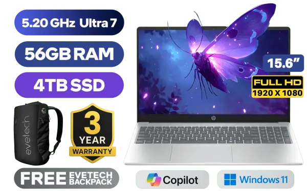 HP Laptop AI 15-fd2003ni Intel® Core™ Ultra 7-255U up to 5.20GHz, 12MB Cache Processor, 12x Cores, 14x Threads / 56GB DDR5 RAM / 4TB Ultra-Fast NVME SSD / 15.6" FHD (1920 x 1080) Anti-glare IPS-Level Display / Integrated Intel® Graphics / Windows 11 Home (64bit) / Realtek 8852BE-VT Wi-Fi 6 Wireless LAN / Bluetooth 5.4 / 1080p FHD Camera / 2x USB Type-A / 1x USB Type-C (Power Delivery & DisplayPort) / 1x HDMI / 1x Microphone and Headphone Combo Jack / Kensington Lock / US Full Non backlit Keyboard / Dual Integrated Speakers / HP Laptop AI 15-fd2003ni Core Ultra 7 Laptop DealHP Laptop AI 15-fd2003ni Intel® Core™ Ultra 7-255U up to 5.20GHz, 12MB Cache Processor, 12x Cores, 14x Threads / 56GB DDR5 RAM / 4TB Ultra-Fast NVME SSD / 15.6" FHD (1920 x 1080) Anti-glare IPS-Level Display / Integrated Intel® Graphics / Windows 11 Home (64bit) / Realtek 8852BE-VT Wi-Fi 6 Wireless LAN / Bluetooth 5.4 / 1080p FHD Camera / 2x USB Type-A / 1x USB Type-C (Power Delivery & DisplayPort) / 1x HDMI / 1x Microphone and Headphone Combo Jack / Kensington Lock / US Full Non backlit Keyboard / Dual Integrated Speakers / HP Laptop AI 15-fd2003ni Core Ultra 7 Laptop Deal [D34JMEA/56GB/4TB] / 3 YEARS WARRANTY / [+] GET FREE EVETECH NEO Premium Gaming Backpack+ FREE DELIVERY !