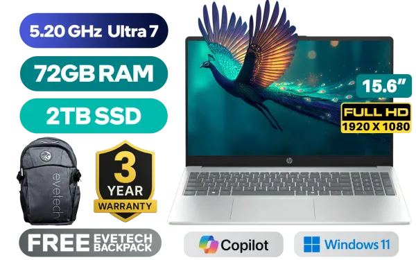 HP Laptop AI 15-fd2003ni Intel® Core™ Ultra 7-255U up to 5.20GHz, 12MB Cache Processor, 12x Cores, 14x Threads / 72GB DDR5 RAM / 2TB Ultra-Fast NVME SSD / 15.6" FHD (1920 x 1080) Anti-glare IPS-Level Display / Integrated Intel® Graphics / Windows 11 Home (64bit) / Realtek 8852BE-VT Wi-Fi 6 Wireless LAN / Bluetooth 5.4 / 1080p FHD Camera / 2x USB Type-A / 1x USB Type-C (Power Delivery & DisplayPort) / 1x HDMI / 1x Microphone and Headphone Combo Jack / Kensington Lock / US Full Non backlit Keyboard / Dual Integrated Speakers / HP Laptop AI 15-fd2003ni Core Ultra 7 Laptop DealHP Laptop AI 15-fd2003ni Intel® Core™ Ultra 7-255U up to 5.20GHz, 12MB Cache Processor, 12x Cores, 14x Threads / 72GB DDR5 RAM / 2TB Ultra-Fast NVME SSD / 15.6" FHD (1920 x 1080) Anti-glare IPS-Level Display / Integrated Intel® Graphics / Windows 11 Home (64bit) / Realtek 8852BE-VT Wi-Fi 6 Wireless LAN / Bluetooth 5.4 / 1080p FHD Camera / 2x USB Type-A / 1x USB Type-C (Power Delivery & DisplayPort) / 1x HDMI / 1x Microphone and Headphone Combo Jack / Kensington Lock / US Full Non backlit Keyboard / Dual Integrated Speakers / HP Laptop AI 15-fd2003ni Core Ultra 7 Laptop Deal [D34JNEA/72GB/2TB] / 3 YEARS WARRANTY / [+] GET FREE EVETECH FLUX Premium Gaming Backpack+ FREE DELIVERY !