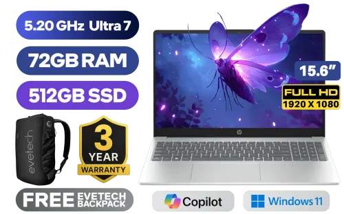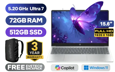 HP Laptop AI 15-fd2003ni Intel® Core™ Ultra 7-255U up to 5.20GHz, 12MB Cache Processor, 12x Cores, 14x Threads / 72GB DDR5 RAM / 512GB Ultra-Fast NVME SSD / 15.6" FHD (1920 x 1080) Anti-glare IPS-Level Display / Integrated Intel® Graphics / Windows 11 Home (64bit) / Realtek 8852BE-VT Wi-Fi 6 Wireless LAN / Bluetooth 5.4 / 1080p FHD Camera / 2x USB Type-A / 1x USB Type-C (Power Delivery & DisplayPort) / 1x HDMI / 1x Microphone and Headphone Combo Jack / Kensington Lock / US Full Non backlit Keyboard / Dual Integrated Speakers / HP Laptop AI 15-fd2003ni Core Ultra 7 Laptop DealHP Laptop AI 15-fd2003ni Intel® Core™ Ultra 7-255U up to 5.20GHz, 12MB Cache Processor, 12x Cores, 14x Threads / 72GB DDR5 RAM / 512GB Ultra-Fast NVME SSD / 15.6" FHD (1920 x 1080) Anti-glare IPS-Level Display / Integrated Intel® Graphics / Windows 11 Home (64bit) / Realtek 8852BE-VT Wi-Fi 6 Wireless LAN / Bluetooth 5.4 / 1080p FHD Camera / 2x USB Type-A / 1x USB Type-C (Power Delivery & DisplayPort) / 1x HDMI / 1x Microphone and Headphone Combo Jack / Kensington Lock / US Full Non backlit Keyboard / Dual Integrated Speakers / HP Laptop AI 15-fd2003ni Core Ultra 7 Laptop Deal [D34JMEA/72GB] / 3 YEARS WARRANTY / [+] GET FREE EVETECH NEO Premium Gaming Backpack+ FREE DELIVERY !