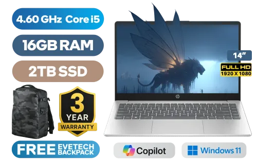 HP Laptop 14-ep0026ni 13th Gen Intel Core i5-1334U up to 4.60GHz Processor, 12MB Cache, 10x Cores, 12x Threads / 16GB DDR4 RAM / 2TB Ultra-Fast NVME SSD / 14" FHD (1920 x 1080) Anti-Glare Display / Integrated Intel Iris Xe Graphics / Windows 11 Home(64bit) / Realtek 8852BE-VT WiFi 6 Wireless LAN / Bluetooth 5.4 / 720p HD camera / 2x USB Type-A / 1x USB Type-C (Supports DisplayPort) / 1x HDMI / 1x Headphone And Microphone Combo Jack / Dual Speakers / HP Laptop 14s-ep0026ni Intel Core i5 LaptopHP Laptop 14-ep0026ni 13th Gen Intel Core i5-1334U up to 4.60GHz Processor, 12MB Cache, 10x Cores, 12x Threads / 16GB DDR4 RAM / 2TB Ultra-Fast NVME SSD / 14" FHD (1920 x 1080) Anti-Glare Display / Integrated Intel Iris Xe Graphics / Windows 11 Home(64bit) / Realtek 8852BE-VT WiFi 6 Wireless LAN / Bluetooth 5.4 / 720p HD camera / 2x USB Type-A / 1x USB Type-C (Supports DisplayPort) / 1x HDMI / 1x Headphone And Microphone Combo Jack / Dual Speakers / HP Laptop 14s-ep0026ni Intel Core i5 Laptop [C92D1EA/2TB] / 3 YEARS WARRANTY / [+] GET FREE EVETECH DASH Premium Gaming Backpack+ FREE DELIVERY !