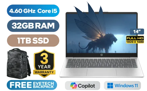 HP Laptop 14-ep0026ni 13th Gen Intel Core i5-1334U up to 4.60GHz Processor, 12MB Cache, 10x Cores, 12x Threads / 32GB DDR4 RAM / 1TB Ultra-Fast NVME SSD / 14" FHD (1920 x 1080) Anti-Glare Display / Integrated Intel Iris Xe Graphics / Windows 11 Home(64bit) / Realtek 8852BE-VT WiFi 6 Wireless LAN / Bluetooth 5.4 / 720p HD camera / 2x USB Type-A / 1x USB Type-C (Supports DisplayPort) / 1x HDMI / 1x Headphone And Microphone Combo Jack / Dual Speakers / HP Laptop 14s-ep0026ni Intel Core i5 LaptopHP Laptop 14-ep0026ni 13th Gen Intel Core i5-1334U up to 4.60GHz Processor, 12MB Cache, 10x Cores, 12x Threads / 32GB DDR4 RAM / 1TB Ultra-Fast NVME SSD / 14" FHD (1920 x 1080) Anti-Glare Display / Integrated Intel Iris Xe Graphics / Windows 11 Home(64bit) / Realtek 8852BE-VT WiFi 6 Wireless LAN / Bluetooth 5.4 / 720p HD camera / 2x USB Type-A / 1x USB Type-C (Supports DisplayPort) / 1x HDMI / 1x Headphone And Microphone Combo Jack / Dual Speakers / HP Laptop 14s-ep0026ni Intel Core i5 Laptop [C92D1EA/32GB/1TB] / 3 YEARS WARRANTY / [+] GET FREE EVETECH DASH Premium Gaming Backpack+ FREE DELIVERY !