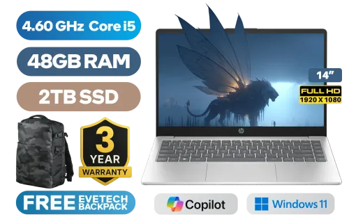 HP Laptop 14-ep0026ni 13th Gen Intel Core i5-1334U up to 4.60GHz Processor, 12MB Cache, 10x Cores, 12x Threads / 48GB DDR4 RAM / 2TB Ultra-Fast NVME SSD / 14" FHD (1920 x 1080) Anti-Glare Display / Integrated Intel Iris Xe Graphics / Windows 11 Home(64bit) / Realtek 8852BE-VT WiFi 6 Wireless LAN / Bluetooth 5.4 / 720p HD camera / 2x USB Type-A / 1x USB Type-C (Supports DisplayPort) / 1x HDMI / 1x Headphone And Microphone Combo Jack / Dual Speakers / HP Laptop 14s-ep0026ni Intel Core i5 LaptopHP Laptop 14-ep0026ni 13th Gen Intel Core i5-1334U up to 4.60GHz Processor, 12MB Cache, 10x Cores, 12x Threads / 48GB DDR4 RAM / 2TB Ultra-Fast NVME SSD / 14" FHD (1920 x 1080) Anti-Glare Display / Integrated Intel Iris Xe Graphics / Windows 11 Home(64bit) / Realtek 8852BE-VT WiFi 6 Wireless LAN / Bluetooth 5.4 / 720p HD camera / 2x USB Type-A / 1x USB Type-C (Supports DisplayPort) / 1x HDMI / 1x Headphone And Microphone Combo Jack / Dual Speakers / HP Laptop 14s-ep0026ni Intel Core i5 Laptop [C92D1EA/48GB/2TB] / 3 YEARS WARRANTY / [+] GET FREE EVETECH DASH Premium Gaming Backpack+ FREE DELIVERY !